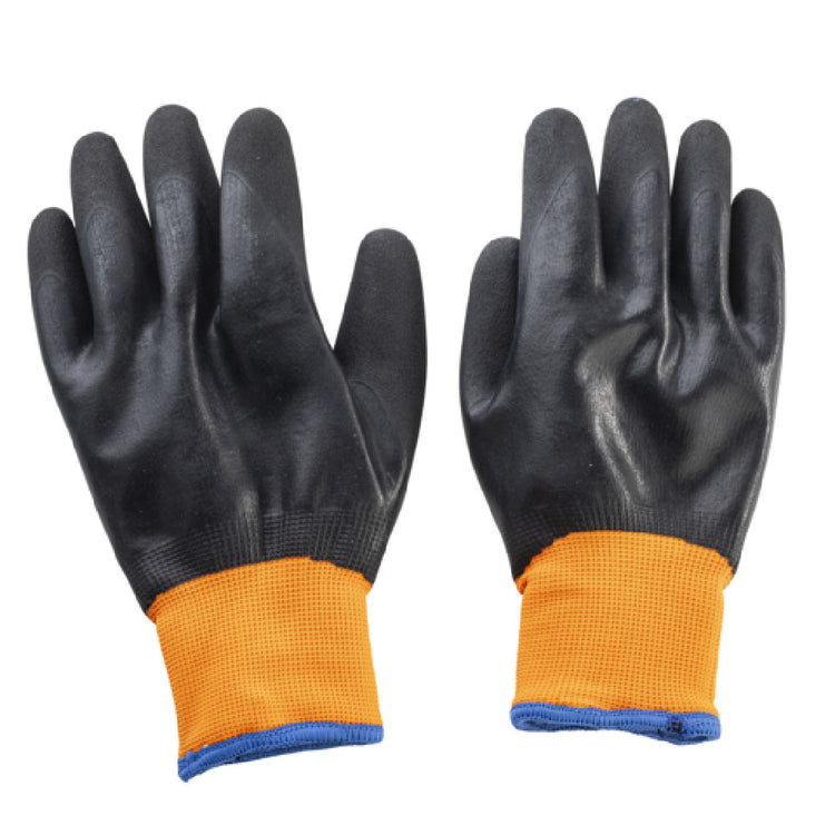 The Tablecraft 12248 Large Freezer Glove measures 10.5" x 4.25" x 1" and is distinguished by its black color, making it an essential tool for industries dealing with low-temperature environments. This glove is constructed with a durable polyester fabric, ensuring flexibility and comfort even in freezer conditions. The glove features a blue cuff, which not only adds a splash of color but also provides a secure fit, preventing it from slipping off during use. Offered as a pair of two, the gloves cater to both individual and industrial use, making them suitable for various markets such as food service, logistics, and cold storage facilities. The combination of robust material and ergonomic design enhances the protection and efficiency of users, making these gloves a practical choice for anyone needing to handle frozen goods regularly. The Tablecraft 12248 Large Freezer Glove is designed for Cash & Carry, appealing to businesses looking to stock up on reliable protective gear without the need for detailed purchasing processes. This product effectively meets the demands of professionals who require both safety and comfort while working in cold environments.