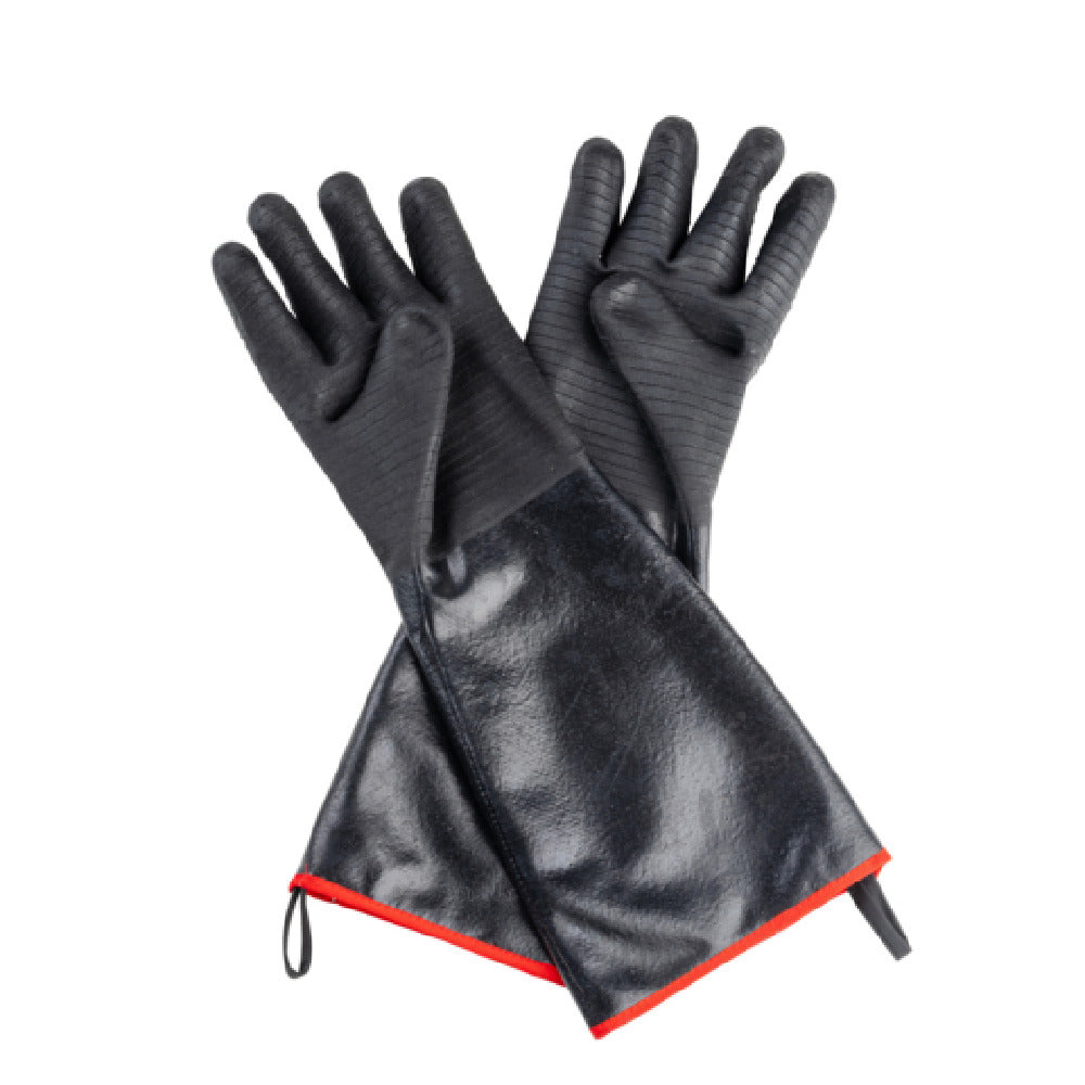 The Tablecraft 12298 High Heat Glove is an essential tool for professional kitchens, offering robust protection in high-temperature environments. Measuring 6" x 2" x 18", these black gloves with a distinctive red cuff are crafted from neoprene, a material renowned for its heat-resistant properties and durability. Sold as a pair of two, these gloves are designed with both safety and comfort in mind, ensuring a secure grip and dexterity for the wearer. The neoprene construction provides superior protection against heat, making them suitable for handling hot pots, pans, and other cookware. The bold color combination not only enhances visibility but also signifies their high-heat functionality, a vital feature in bustling kitchen settings. The gloves' dimensions ensure ample coverage while maintaining flexibility, allowing users to work efficiently without compromising safety. Ideal for various segment markets within the foodservice industry, including restaurants, catering services, and culinary schools, the Tablecraft 12298 High Heat Glove is a reliable choice for those requiring dependable performance under demanding conditions. Their cash and carry availability further adds to their appeal, offering immediate access for businesses in need of high-quality heat protection solutions.
