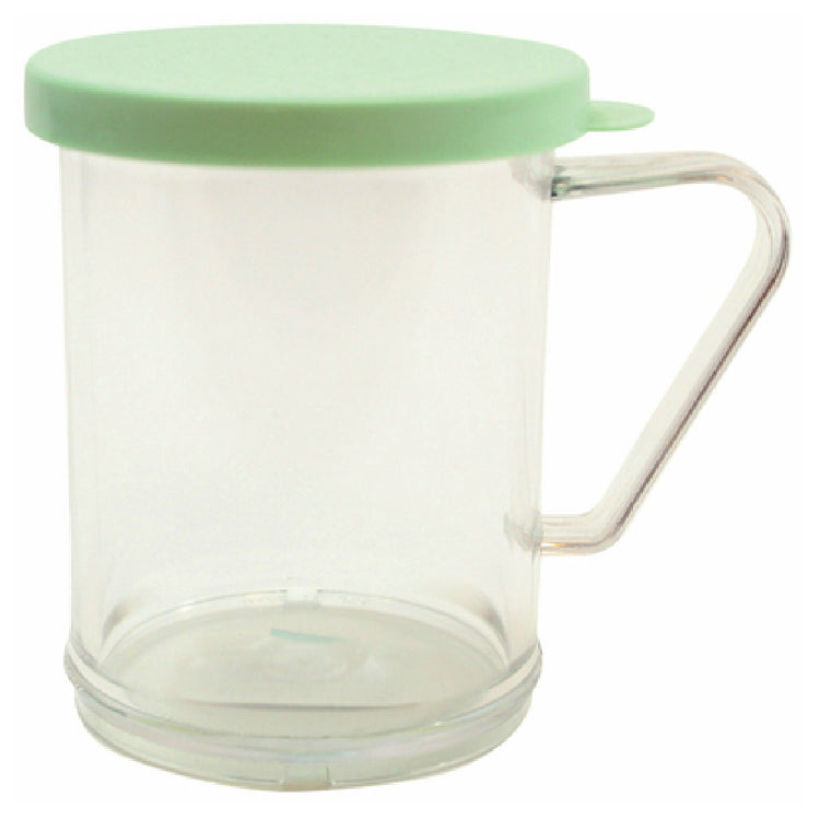 Tablecraft 166B Dredge/Shaker 10 Oz. is an essential tool designed specifically for fine ground spices, providing a blend of functionality and convenience that caters to various market segments within the culinary industry. With a generous capacity of 10 ounces, this dredge/shaker is constructed from durable poly material and features a practical handle that ensures ease of use, making it suitable for professional chefs and home cooks alike. The green snap-tight plastic lid guarantees that spices remain fresh and prevents accidental spills, a feature highly valued in fast-paced kitchen environments. This product is dishwasher safe, offering hassle-free cleaning that is vital for maintaining hygiene standards in food service operations. Manufactured in the USA, the Tablecraft 166B epitomizes quality and safety, being BPA free, which underscores a commitment to health-conscious consumers and eco-friendly practices. Its thoughtful design and robust construction make it a reliable choice for any setting where precision and efficiency in spice dispensing are required, such as restaurants, bakeries, and catering services. The Tablecraft 166B Dredge/Shaker is a testament to practical innovation, addressing the needs of a diverse range of users by combining usability, safety, and quality in a single, adaptable product.