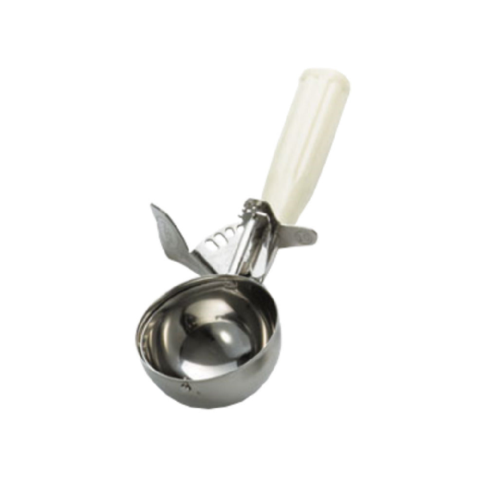 The Tablecraft 2110 Cash & Carry Disher Size 10-3-1/4 Oz. Capacity 8.75" x 3.5" x 1.75" is a versatile kitchen tool designed to meet the demanding needs of various segments within the food service industry. With a capacity of 3-1/4 oz, this disher is perfect for precise portion control, making it an invaluable asset for professional kitchens, catering services, and bakeries. Its size dimensions of 8.75" x 3.5" x 1.75" ensure it is both compact and efficient for daily kitchen operations. Crafted from high-quality 18/8 stainless steel, the disher provides durability and resistance to corrosion, enhancing its longevity and performance under regular use. The ivory handle not only adds an aesthetic touch but also provides a comfortable grip, ensuring ease of use during repetitive tasks. The Tablecraft 2110 is dishwasher safe, simplifying the cleaning process and maintaining hygiene standards effortlessly. Furthermore, the NSF certification guarantees that it meets strict public health and safety standards, making it a trustworthy choice for culinary professionals. Individually boxed for convenience, the Tablecraft 2110 Cash & Carry Disher stands out as a reliable, high-quality solution tailored to the specific needs of the food service sector, ensuring consistency and efficiency in every scoop.