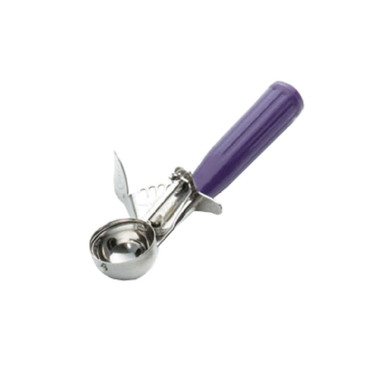 The Tablecraft 2140 Cash & Carry Disher Size 40 is a precision-engineered tool tailored for professional culinary environments, boasting a 7/8 oz. capacity that makes it ideal for portion control across various food service settings. Its dimensions - 7.625 inches in length, 3.125 inches in width, and 1.625 inches in height - provide a compact yet efficient design for seamless integration into any kitchen workflow. Fabricated from 18/8 stainless steel, this disher combines durability with resistance to corrosion, ensuring longevity even with frequent use. The orchid-colored handle not only adds a touch of elegance but also ensures easy identification and a secure grip, reducing the risk of slippage during use. This product is dishwasher safe, enhancing convenience for busy kitchens by simplifying the cleaning process. Additionally, it comes individually boxed, maintaining its pristine condition during transport and storage. Certified by NSF, the Tablecraft 2140 Cash & Carry Disher meets rigorous public health and safety standards, making it a reliable choice for both commercial and institutional food service sectors. This high-quality disher is designed to meet the demands of chefs and kitchen staff, ensuring precise servings and consistent results, thereby maximizing efficiency and customer satisfaction.