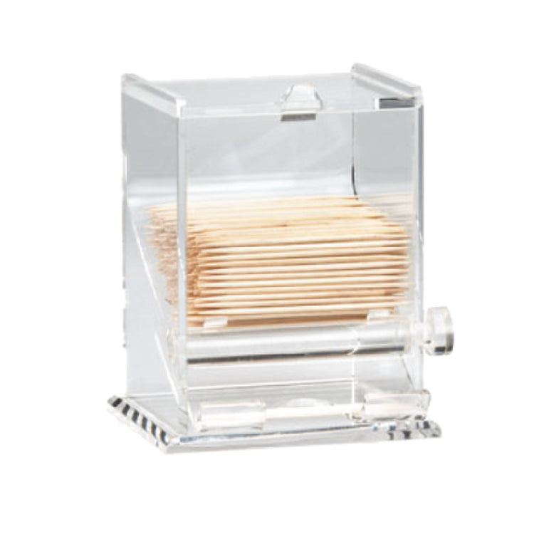 The Tablecraft 228 Toothpick Dispenser stands out with its compact dimensions of 3-1/4" x 3-1/4" x 4-1/2", making it a perfect fit for both small and large dining establishments seeking efficient and space-saving solutions. This top-loading dispenser is crafted from transparent acrylic, allowing easy monitoring of toothpick levels, which enhances user convenience and ensures timely refilling. Its design focuses on durability and practicality, being dishwasher safe and thus promoting ease of cleaning and hygiene, a crucial feature for maintaining high standards in food service environments. The Tablecraft 228 is highly versatile, catering to various market segments within the hospitality industry, including restaurants, cafes, and catering services, where maintaining cleanliness and accessibility to essentials like toothpicks is paramount. Its robust construction and user-friendly features make it a reliable choice for settings that prioritize both functionality and aesthetic appeal, seamlessly blending into diverse dining or service areas. The transparent design not only ensures the functional aspect but also adds a modern touch to the environment, setting it apart as a practical and stylish solution for toothpick dispensing needs across different sectors in the hospitality industry.