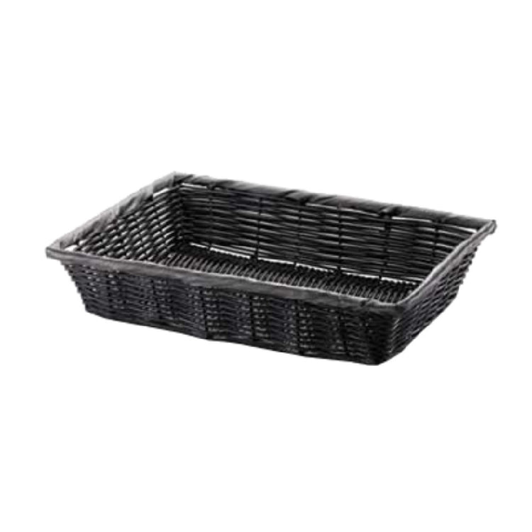 The Tablecraft 2489 Basket 16" x 11" x 3" Rectangular is a meticulously designed hand-woven basket crafted from durable polypropylene cord, presented in an elegant black hue. With dimensions of 16 inches in length, 11 inches in width, and 3 inches in height, this basket provides a generous capacity to accommodate a variety of items, making it a versatile choice across different market segments within the foodservice and hospitality industry. Its hand-woven construction ensures structural integrity and aesthetic appeal, suitable for both casual and upscale dining environments. The polypropylene material is known for its resilience and easy maintenance, offering long-lasting durability to withstand everyday use. This basket is ideal for showcasing bread, fruits, or other culinary delights in a stylish manner, enhancing both presentation and functionality. To maintain quality and consistency, the Tablecraft 2489 Basket must be purchased in multiples of six, making it a practical solution for businesses requiring bulk quantities. Its sleek and modern design complements a wide range of table settings, making it a valuable addition to any professional kitchen or dining establishment seeking an efficient and attractive serving solution.