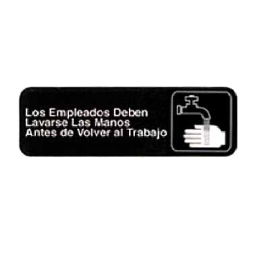 The Tablecraft 394545 Cash & Carry Sign 3" x 9" is an essential signage solution for establishments aiming to maintain high hygiene standards and comply with health regulations. This sign, featuring a direct message in Spanish, "Los Empleados Deben Lavarse Las Manos Antes De Volver Al Trabajo" (Employees Must Wash Hands Before Returning To Work), is designed for diverse workplace environments, including restaurants, offices, and manufacturing facilities. The sign measures 3 inches by 9 inches and showcases a bold white-on-black color scheme that ensures high visibility. Crafted from durable plastic, it is both dishwasher safe, offering ease of cleaning and maintenance. The pressure-sensitive adhesive backing facilitates straightforward installation on various surfaces, making it an adaptable choice for any workspace. Its Spanish language emphasis supports inclusivity and clear communication in workplaces with Spanish-speaking staff. The Tablecraft 394545 sign is a practical and effective tool for promoting hygiene practices, ensuring that employees remember to wash their hands before returning to work. Its reliable build and clear design make it a necessary addition to environments where maintaining clean and safe practices is critical for health and efficiency.