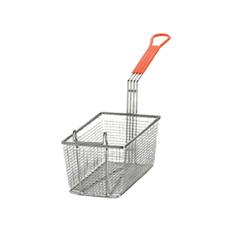The Tablecraft 43 Fry Basket is a high-quality kitchen tool renowned for its precise dimensions of 24-1/2" x 6-3/8" x 11-1/2", making it an ideal choice for culinary professionals and food service establishments. This rectangular fry basket is crafted with durable mesh, ensuring efficient cooking performance and long-lasting use. A standout feature is its orange cool-to-touch PVC handle, designed to enhance user safety and comfort during high-temperature cooking tasks. Additionally, the fry basket is nickel plated, which not only contributes to its aesthetic appeal but also provides added corrosion resistance and durability. It is important to note that this fry basket is intended for hand wash only, to maintain its quality and longevity. The Tablecraft 43 Fry Basket is versatile and finds its utility in various market segments, from restaurant kitchens focusing on high-volume frying needs to catering services requiring reliable cookware. Its robust construction and thoughtful design cater to professionals seeking efficiency and safety in food preparation, making it a valuable addition to any culinary setting.