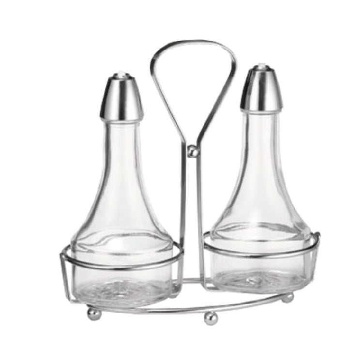 The Tablecraft 608N Oil & Vinegar Dispenser Set is an elegantly designed duo that features two 8 oz. clear glass bottles, offering a perfect blend of functionality and aesthetic appeal for culinary professionals and home chefs alike. This set is highlighted by its dishwasher-safe glass, ensuring easy maintenance and long-lasting clarity. Each bottle is crowned with a chrome-plated ABS top, which requires hand washing to maintain its sleek finish and durability. The set is complemented by a chrome-plated rack, also necessitating hand washing, providing a stylish and organized solution for tabletop or kitchen counter presentation. The minimum order requirement is one set, making it accessible for small-scale operations or personal use, while still being a practical choice for larger establishments seeking to enhance their dining table aesthetics. The clear glass composition allows for quick identification of contents, supporting efficient kitchen operations, while the chrome elements add a touch of modern elegance, broadening its appeal across various market segments, from casual dining environments to upscale restaurants. This combination of functional design and quality materials positions the Tablecraft 608N Dispenser Set as a versatile tool within the food service industry.