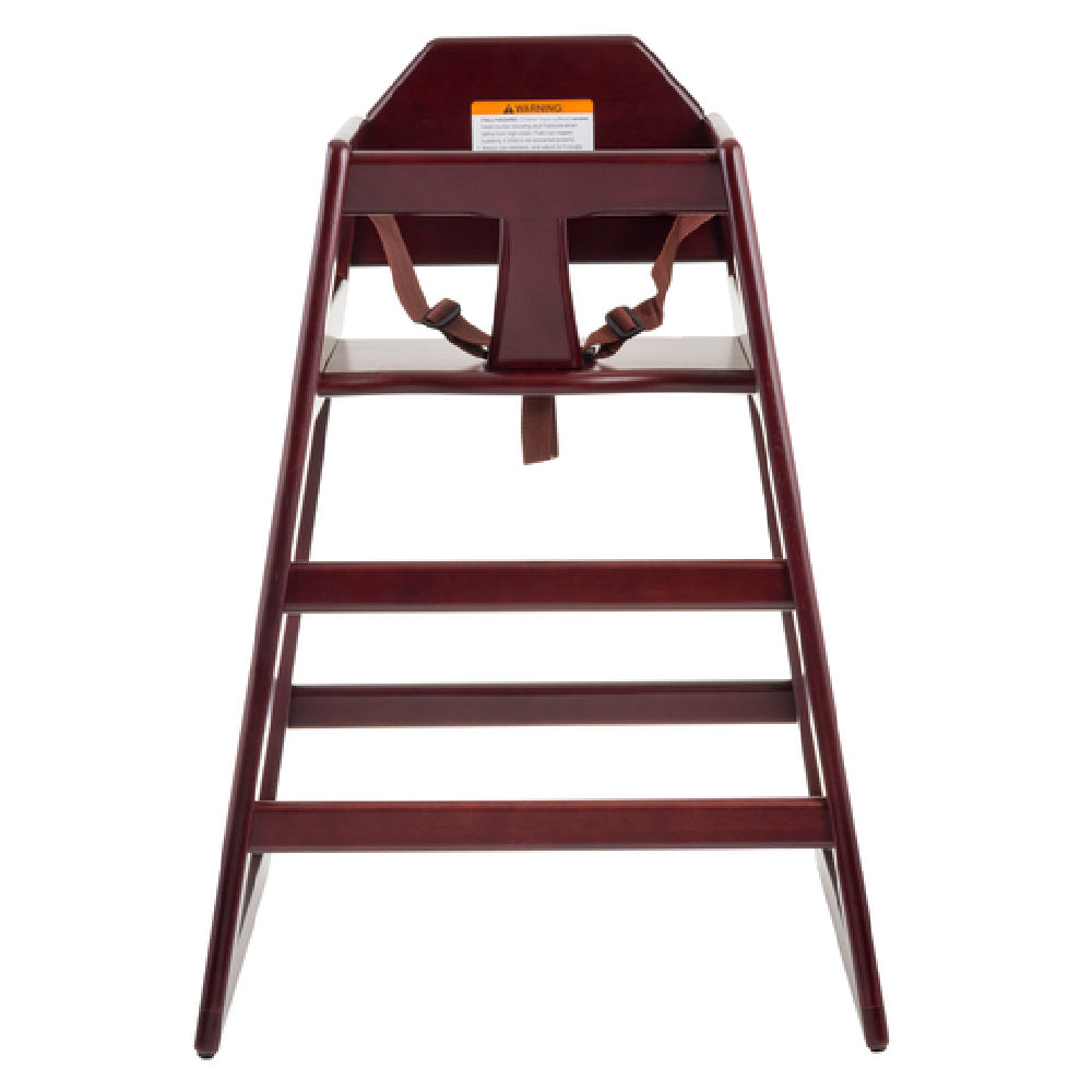 The Tablecraft 6464062 High Chair is a versatile and practical seating solution, measuring 19-3/4" x 19-3/4" x 29"H, designed specifically to meet the needs of family-friendly dining establishments. Made from durable rubberwood with a sophisticated mahogany finish, this high chair offers both aesthetic appeal and long-lasting performance. The stackable design ensures efficient storage, making it an excellent choice for restaurants, cafes, and other dining venues where space optimization is critical. Safety is a top priority with the inclusion of a washable replaceable 3-point seatbelt and a front passive restraint, ensuring young diners are securely seated. The high chair complies with ASTM F404-18 standards, reflecting its commitment to safety and quality. While the product arrives unassembled, its thoughtful design allows for straightforward assembly. This high chair is not only a functional asset for any family-focused dining environment but also a stylish addition that complements the overall decor of the space. Whether accommodating families with young children or enhancing the dining experience, the Tablecraft 6464062 High Chair is a reliable and attractive choice for various segments within the hospitality industry.