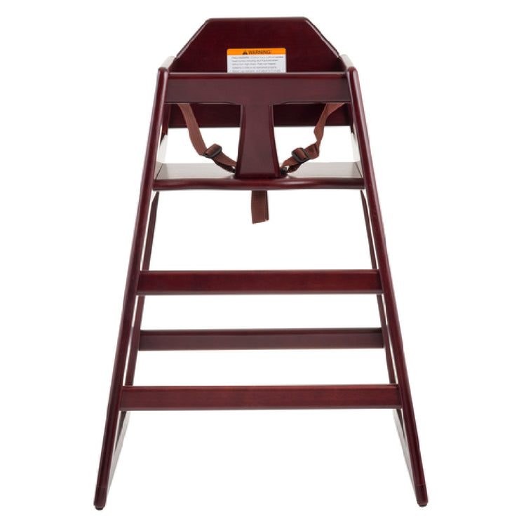 The Tablecraft 6464162 High Chair is meticulously designed with dimensions of 19-3/4" x 19-3/4" x 29"H, providing a sturdy and compact seating solution for children in dining environments. Crafted from robust rubberwood with a rich mahogany finish, this high chair exudes both durability and elegance. It features a washable, replaceable 3-point seatbelt system alongside a front passive restraint, ensuring enhanced safety and security for its young occupants. This high chair is stackable, allowing for efficient space utilization in storage or busy dining settings. Complying with ASTM F404-18 standards, the Tablecraft 6464162 High Chair guarantees adherence to child safety and product performance requirements. Delivered fully assembled, this high chair is UPS oversized, indicating its substantial build and readiness for immediate use. Its combination of practicality, safety, and aesthetic appeal makes it a valuable asset for restaurants, cafés, and other food service establishments seeking a reliable and visually appealing child seating option.