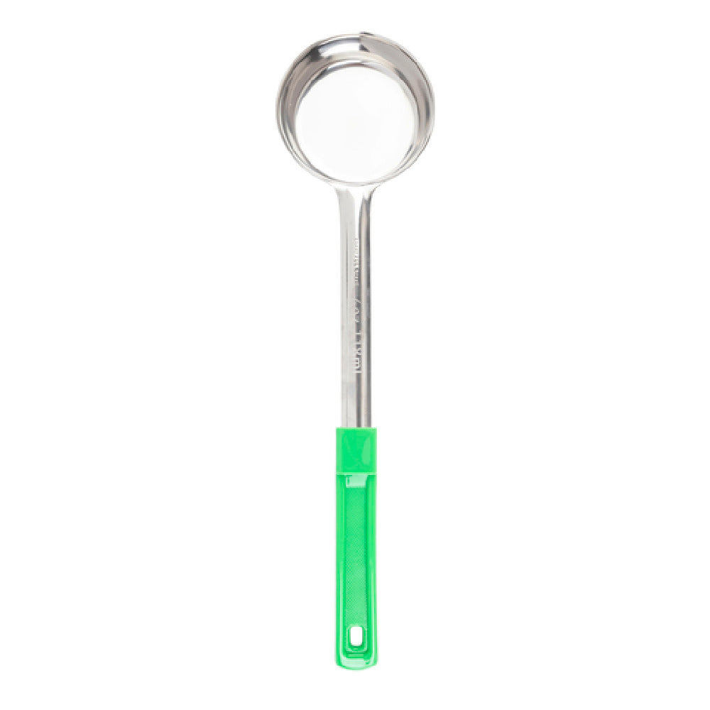 The Tablecraft 6704 Spoonout 4 Oz. One-piece is a meticulously designed kitchen tool catering to diverse culinary environments, from bustling commercial kitchens to home cooking enthusiasts. This one-piece spoonout is crafted from high-quality stainless steel, ensuring durability and resistance to corrosion, which is essential for long-term use in high-demand settings. Its solid construction provides a seamless integration of the handle and spoon, eliminating crevices that typically harbor bacteria, thus enhancing hygiene. The bright green handle not only adds a pop of color but also aids in quick identification among other kitchen tools, catering to color-coded kitchen systems. Dishwasher safe, it promises convenience and efficiency in cleaning, crucial for maintaining high standards of cleanliness in food preparation areas. With a precise capacity of 4 oz., it is perfect for portion control, making it an indispensable tool in both commercial and home kitchens where consistency is key. The Tablecraft 6704 Spoonout is a testament to thoughtful engineering, combining functionality with practicality to meet the exacting demands of professional chefs and home cooks alike, providing an exceptional balance of efficiency, accuracy, and durability. This spoonout is designed to withstand the rigors of daily use, making it a reliable choice for any food service operation.
