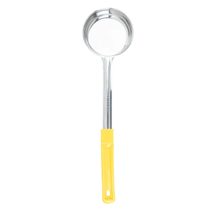 The Tablecraft 6705 Spoonout 5 Oz. One-piece is a meticulously crafted utensil, ideal for culinary professionals and home chefs who demand precision and durability in their kitchen tools. This solid one-piece spoonout is expertly designed with a 5-ounce capacity, making it perfect for accurate portioning and serving. The stainless steel construction ensures resilience and longevity, standing up to rigorous use in high-volume environments. Featuring a distinct yellow handle, this utensil not only enhances visibility in a bustling kitchen but also adds a splash of color for easy identification. The ergonomic design of the handle provides comfort during extended use, minimizing hand fatigue. Moreover, the dishwasher-safe attribute of this spoonout allows for effortless cleaning and maintenance, making it a practical choice for busy food service establishments. Whether utilized in a commercial kitchen, catering service, or a home setting, the Tablecraft 6705 Spoonout combines functionality with aesthetic appeal, catering to a wide range of culinary applications. Its robust build quality, thoughtful design, and functional efficiency make it an indispensable tool for any food preparation task, ensuring consistent and reliable performance across various market segments within the culinary industry.