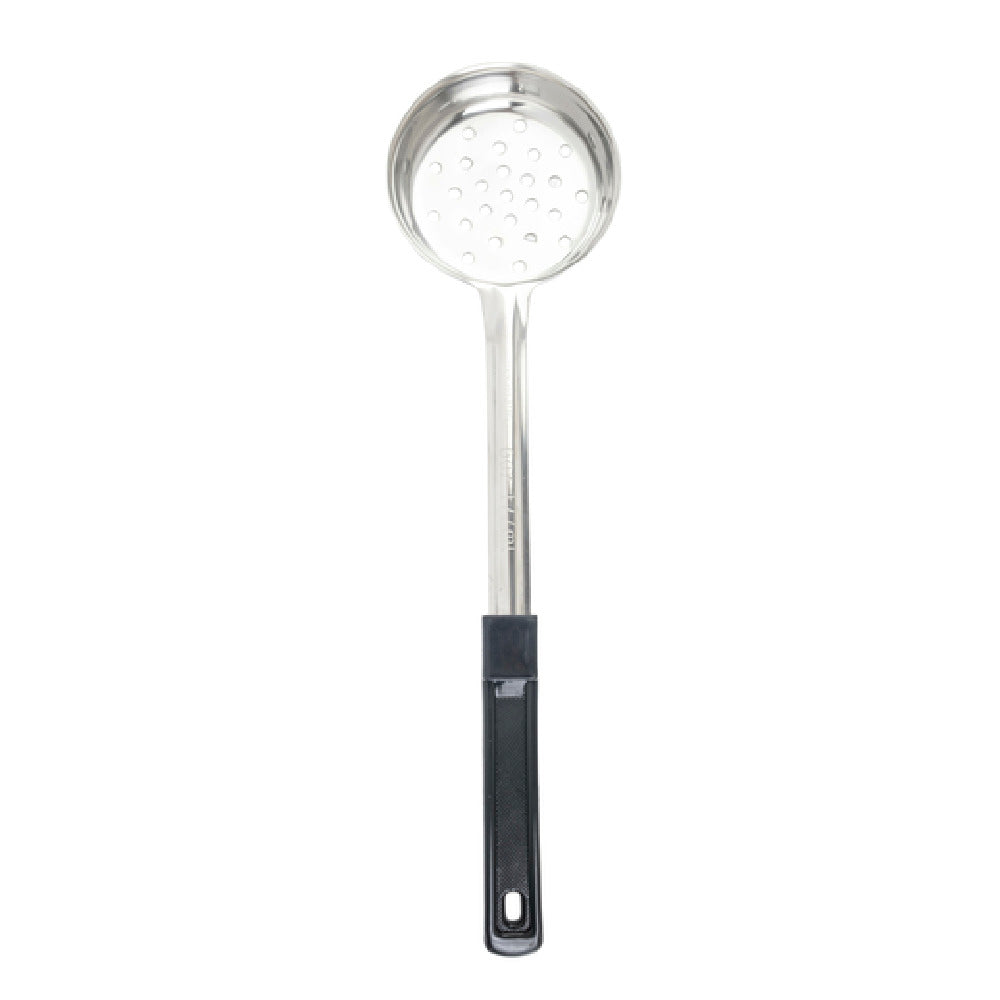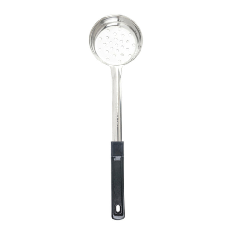 The Tablecraft 7706 Spoonout 6 Oz. One-piece is an indispensable tool designed for both culinary professionals and home cooks who prioritize precision and durability. With a 6-ounce capacity, this spoonout provides an accurate measure for consistent portion control, essential in both commercial and domestic kitchens. Constructed from high-quality stainless steel, it ensures longevity and resistance to rust and corrosion, even with frequent use. The one-piece design eliminates seams and cracks, enhancing hygiene by reducing areas where food particles can hide, making it a practical choice for maintaining sanitary conditions. The perforated feature allows for efficient draining of liquids, which is particularly beneficial for serving dishes that require separation of solids from liquids. Accompanied by a black handle, it offers a comfortable grip and is visually distinct, aiding in quick identification among other utensils. Furthermore, its compatibility with dishwashers simplifies the cleaning process, saving time and effort in busy kitchen environments. The Tablecraft 7706 Spoonout 6 Oz. One-piece stands out in its category by offering a blend of functionality and durability, making it an ideal tool for restaurants, catering services, food preparation settings, and home kitchens that demand reliability and efficiency in their kitchenware.