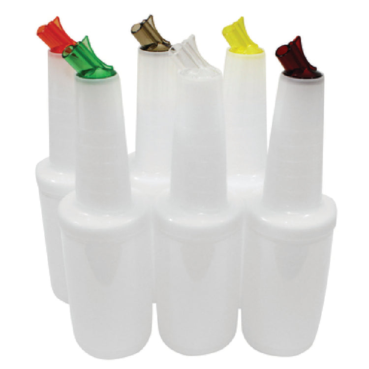The Tablecraft 8032A Cash & Carry PourMaster® Complete Unit Quart is an essential tool for any professional kitchen or bar setting, designed to enhance efficiency and organization. This comprehensive unit features a quart-sized container with an easy grip neck, ensuring comfortable handling during use. It is constructed from durable polyethylene, making it both dishwasher safe and BPA free, which ensures safety and longevity for repeated commercial use. The unit includes an assortment of color-coded pour spouts and caps in brown, green, red, orange, white, and yellow, allowing for easy identification and management of different liquids. This feature adds a significant value to establishments requiring precise and organized pouring solutions, such as restaurants, bars, and catering services. Its thoughtful design supports a wide range of user applications from syrups to oils, making it versatile across various industry segments. The Cash & Carry PourMaster® is not only practical but also a reliable addition to environments where efficiency and safety are paramount. With its easy-to-clean material and intuitive design, this product is a valuable asset tailored to meet the diverse needs of the food and beverage service industries.