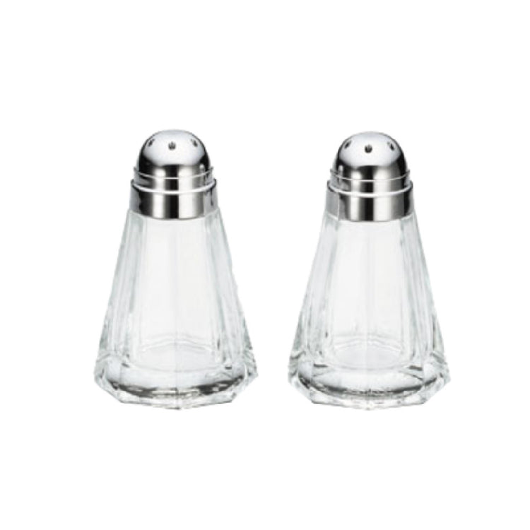 The Tablecraft 80S&P-2 Salt/Pepper Shaker 1-1/2 Oz. 1-3/4" X 3-1/8"H is a versatile and practical choice for any dining establishment seeking reliable seasoning solutions. This shaker, with its paneled glass design, combines both aesthetic appeal and functionality, making it suitable for a variety of settings, from casual dining to upscale restaurants. With a capacity of 1-1/2 ounces, it provides ample space for salt or pepper, reducing the frequency of refills and ensuring a smooth dining experience. Measuring 1-3/4 inches in diameter and standing 3-1/8 inches tall, this shaker is compact yet efficient, fitting seamlessly into any tabletop arrangement. The chrome-plated ABS tops not only enhance the visual appeal but also ensure durability and resistance to corrosion. Designed to be dishwasher safe, it simplifies the cleaning process, offering convenience to busy kitchen environments. Additionally, this shaker's compatibility with rack model number 607R adds to its functionality, allowing for organized storage and easy accessibility. Packaged in two dozen per inner box, it is available for purchase in multiples of 24, catering to establishments of varying sizes. The Tablecraft 80S&P-2 Shaker embodies a perfect blend of elegance and practicality, making it a valuable asset in the foodservice industry.