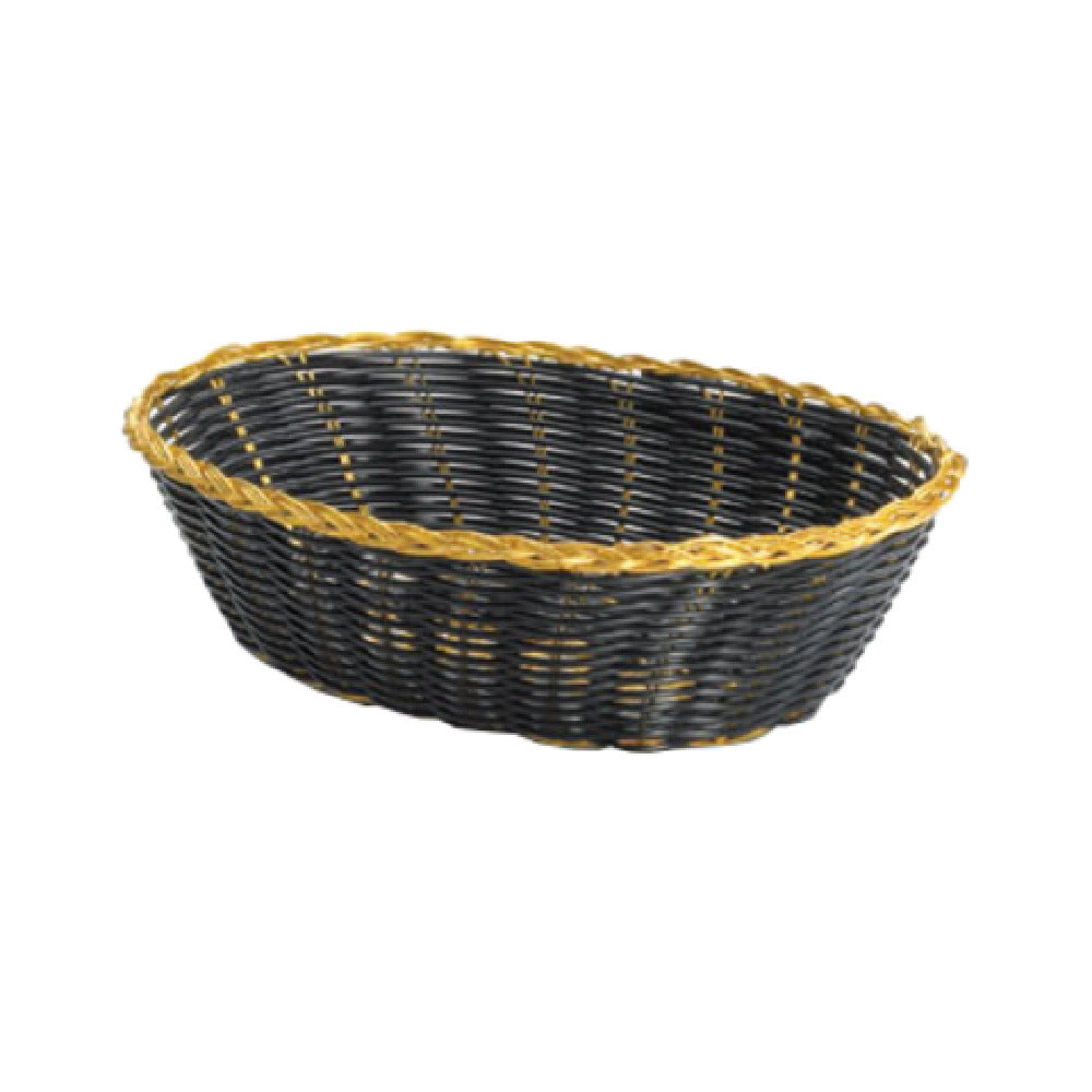 The Tablecraft 975B Basket is a meticulously designed piece, measuring 9 inches by 6.5 inches by 2.5 inches in an oval shape, tailored for versatile utility across various industry segments. Crafted with a hand-woven technique, this basket embodies an artisanal touch, offering a blend of aesthetic appeal and functional design. Its construction utilizes a polypropylene cord, ensuring durability and resilience in diverse settings. The basket's color scheme is striking, featuring a sophisticated black finish complemented by an elegant gold metal trim, making it a distinctive addition to any tabletop or display. This product is designed for hand wash only, emphasizing the care required to maintain its pristine condition and longevity. Suitable for both casual and upscale environments, the Tablecraft 975B Basket serves as an ideal solution for presenting bread, fruits, or decorative items. Its compact dimensions allow for efficient use of space, catering to the needs of restaurants, cafes, and hospitality establishments seeking to enhance their presentation standards. By combining practical design with quality materials, this basket stands out as a valuable investment for businesses aiming to offer a unique and refined dining experience.