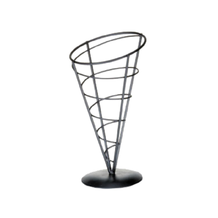 The Tablecraft AC59 Vertigo Collection™ Appetizer Cone - 5" x 9" is a distinctive serving solution designed for elegance and functionality. Constructed from black powder-coated metal, this appetizer cone stands out with its sleek design, making it an appealing choice for upscale restaurants, catering events, and modern hospitality environments. Measuring 5 inches in diameter and 9 inches in height, it provides an ideal presentation platform for appetizers, snacks, or small bites, enhancing the aesthetic appeal of culinary creations. The hand wash only specification ensures that the product maintains its quality finish, suitable for establishments that prioritize detailed hand care for their serving accessories. This product is designed for professionals seeking a combination of durability and style in their serving ware, catering to market segments focused on sophisticated dining experiences. The Vertigo Collection adds a contemporary touch to any table setting, offering a unique way to impress guests with its artistic structure. Its robust construction makes it not only a practical choice for frequent use but also a durable piece that can withstand the demands of busy service environments, while its elegant design supports the presentation of a wide variety of culinary delights.