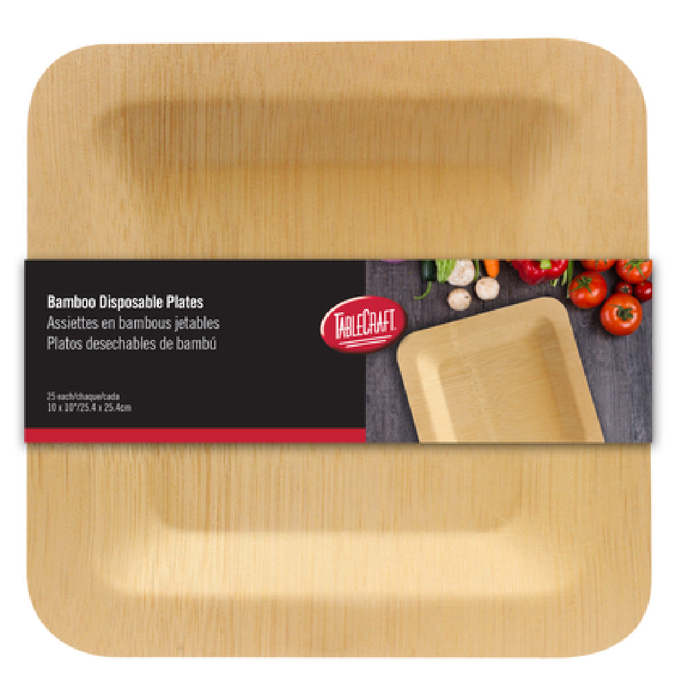 The Tablecraft BAMDSP10 Cash & Carry Disposable Plate is a precisely engineered dining solution that measures 10 inches by 10 inches, presenting a sleek square design. Crafted from bamboo, this plate boasts a natural finish, offering an eco-friendly alternative to traditional disposable dining ware. Each pack contains 25 plates, with a minimum order requirement of one pack, making it highly accessible for varying customer needs. The bamboo composition ensures durability while maintaining a lightweight profile, ideal for both casual and upscale settings. Its disposable nature simplifies post-event cleanup, offering convenience to caterers, event planners, and restaurants aiming to streamline their operations without sacrificing aesthetic appeal. The natural bamboo finish adds a touch of elegance, perfectly complementing contemporary table settings. Versatile in use, these plates cater to diverse market segments, including catering services, eco-conscious consumers, and businesses seeking sustainable options for large gatherings. The 10-inch by 10-inch dimensions provide ample space for serving a variety of culinary presentations, from appetizers to main courses, accommodating the distinct needs of the food service industry. The Tablecraft BAMDSP10 plates merge functionality with environmental consciousness, presenting a compelling option for those prioritizing sustainability in their tableware choices.