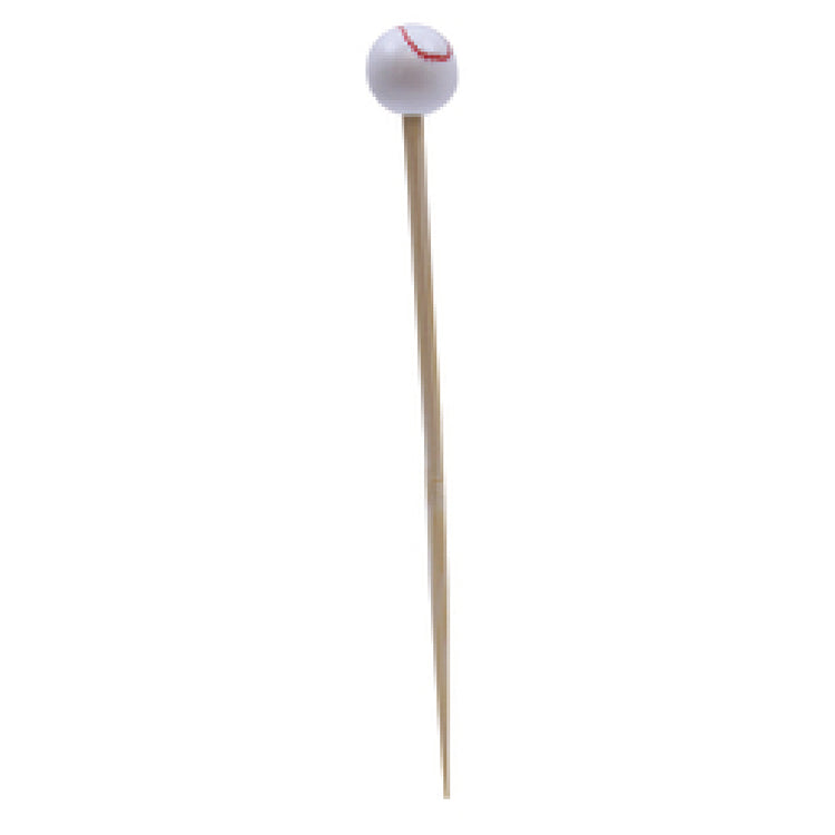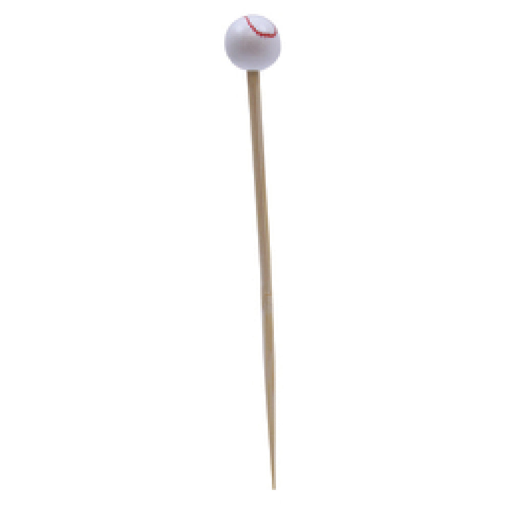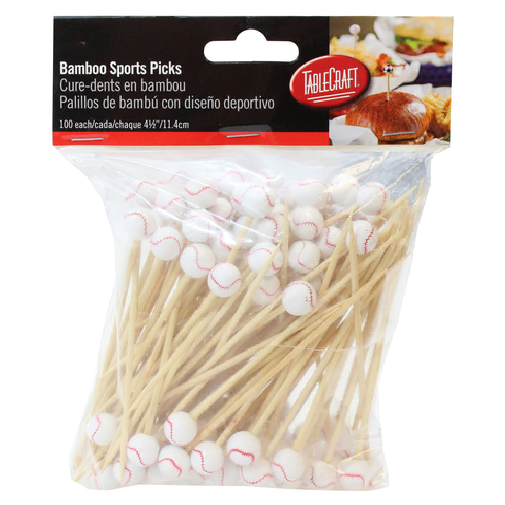 The Tablecraft BAMSP145 Cash & Carry Sport Pick 4-1/2" Baseball At One End is a versatile and visually appealing accessory for diverse event settings. These sport picks are crafted from sustainable bamboo, offering an eco-friendly alternative to plastic picks. Measuring 4-1/2 inches in length, they are ideal for securing appetizers, sandwiches, or cocktail garnishes. The unique design features a baseball motif at one end, making them particularly appealing for sports-related events or themed gatherings. Each pack contains 100 picks, ensuring ample supply for both small and large events. It is important to note that these picks must be purchased in multiples of 12 packs, catering to the needs of high-volume users such as catering companies, event planners, and sports venues. The Tablecraft BAMSP145 not only provides a functional solution for food presentation but also adds a decorative touch that enhances the overall dining experience. This product is especially valuable for businesses looking to align with sustainability trends while also providing a unique, themed presentation option. Its combination of eco-friendly material, ample quantity per purchase, and thematic design makes it a standout choice in the market for sporting event caterers and environmentally-conscious businesses alike.