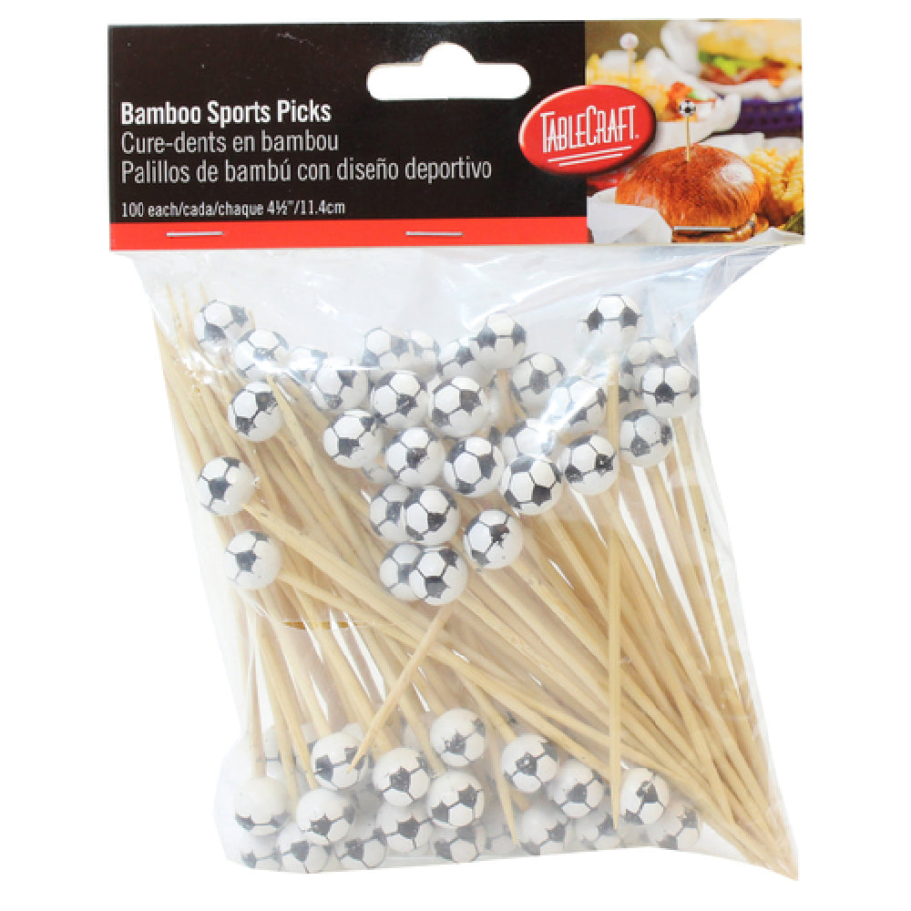 The TableCraft BAMSP545 Cash & Carry Sport Pick 4-1/2" is a unique product designed for versatility and style, featuring a soccer ball at one end, which makes it particularly appealing for sports-themed events and gatherings. Crafted from bamboo, this sport pick offers an eco-friendly option for catering professionals and event planners seeking sustainable alternatives in their service ware. Each pack contains 100 picks, ensuring ample supply for high-volume needs, with a purchase requirement of multiples of 12 packs, catering to larger scale operations. At 4-1/2 inches in length, these picks are ideal for securing appetizers, hors d'oeuvres, and cocktail garnishes, providing practical utility while enhancing presentation aesthetics. The novelty of the soccer ball design adds a thematic element that can elevate the dining experience, making it particularly suitable for sports bars, themed parties, or any event looking to incorporate a playful, sporty touch. This product’s combination of practical function, sustainable material, and thematic design offers a unique value proposition to various segment markets within the food service industry, from event catering to hospitality businesses, that are looking to enhance presentation while maintaining environmental consciousness.