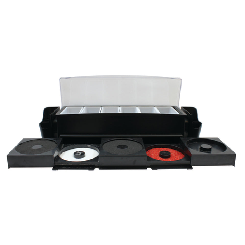 The Tablecraft BCD1400 Cash & Carry Ultimate Garnish Station measures 24-3/4" x 7-1/4" x 6-1/4", making it a compact and efficient solution for various culinary environments. This versatile unit includes one 1-quart and four 1-pint white polypropylene inserts, providing ample space for different ingredients or garnishes. Designed with practicality in mind, it features two caddies and an integrated 5-tray rimming station, ensuring seamless cocktail preparation for bars or restaurants. Constructed from durable ABS plastic, this station combines black and clear elements for a sleek appearance that suits any decor. Dishwasher safe, the BCD1400 facilitates easy cleaning, making it ideal for high-traffic food service establishments where hygiene and efficiency are paramount. This product serves diverse market segments, from small cafes to expansive hospitality venues, with its focus on organization and accessibility. The Tablecraft BCD1400 stands out with its unique blend of functionality and design, optimizing both space and workflow in any professional kitchen or bar setting.