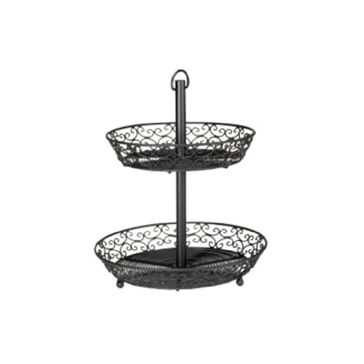 The Tablecraft BKT2A Mediterranean Collection™ Basket Two-tiered 9" & 10-1/2" Baskets is an elegantly designed storage solution that combines functionality with a touch of Mediterranean flair. This two-tiered basket set features baskets with diameters of 9 inches and 10-1/2 inches, offering ample space for a variety of items, which makes it suitable for both commercial and home use. Standing at an overall height of 12-1/4 inches, the basket set is crafted from black powder-coated metal, ensuring durability and resistance against wear and tear. The inclusion of legs adds stability and enhances its aesthetic appeal, making it an eye-catching addition to any setting. Specifically designed for hand wash only, this product requires minimal maintenance while maintaining its refined look. The Tablecraft BKT2A is particularly popular in restaurant and catering environments where presentation and organization are key, as well as in homes looking to enhance their kitchen or dining areas with a stylish and practical accessory. Its robust construction and versatile design make it a sought-after item in the hospitality industry, appealing to those who value both form and function in their service items.