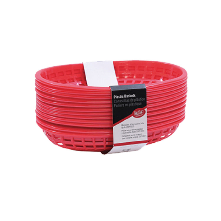 The Tablecraft C1074R Cash & Carry Classic Baskets - 9-1/4" x 6" x 1-3/4" Oval - are a versatile addition to any food service operation, distinguished by their heat resistance up to 150°F/65°C. These baskets are heat lamp, dishwasher, and microwave safe, providing flexibility and convenience across various food presentation and service settings. Made from durable, high-quality plastic, and presented in a vibrant red color, the baskets are designed for both aesthetic appeal and practicality. Manufactured in the USA, these baskets come in display merchandise packs of 12, emphasizing their suitability for high-volume operations. The oval shape offers a classic design that complements a wide range of dining environments, from casual eateries to more formal settings. Importantly, these baskets must be purchased in multiples of 3 packs, reflecting their wholesale distribution model which caters to businesses needing bulk purchases. The Tablecraft C1074R Cash & Carry Classic Baskets are an excellent choice for any food service establishment looking for durable, multifunctional serving solutions that blend reliability with a touch of style.