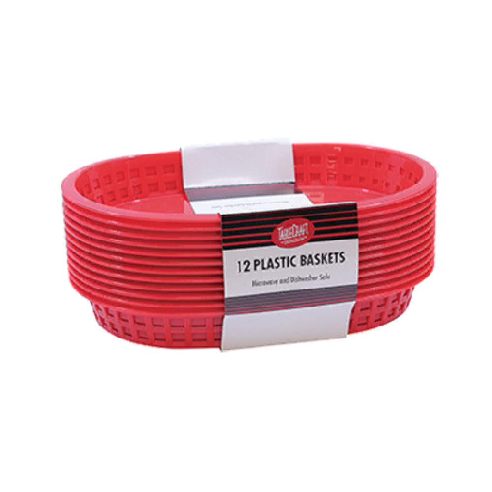 Tablecraft C1076R Cash & Carry Chicago Baskets 10-1/2" X 7" X 1-1/2" are versatile serving solutions designed for a variety of food service settings. These oval baskets are meticulously crafted from durable plastic, ensuring longevity and resilience in daily operations. Measuring 10-1/2 inches in length, 7 inches in width, and 1-1/2 inches in depth, they offer ample space for serving a range of culinary delights. The baskets are heat resistant up to 150°F (65°C), providing safety in environments where food is kept warm before serving. Furthermore, their compatibility with heat lamps, dishwashers, and microwaves underscores their adaptability in fast-paced kitchens, making them perfect for both preparation and presentation needs. The vibrant red color adds a touch of flair, enhancing the visual appeal of any dish. Manufactured in the USA, these baskets come in a display merchandise pack containing 12 baskets per pack and must be purchased in multiples of three packs, catering specifically to commercial requirements. Tablecraft C1076R Cash & Carry Chicago Baskets are ideal for restaurants, catering services, and food courts, offering a unique combination of practicality, safety, and style in food presentation.