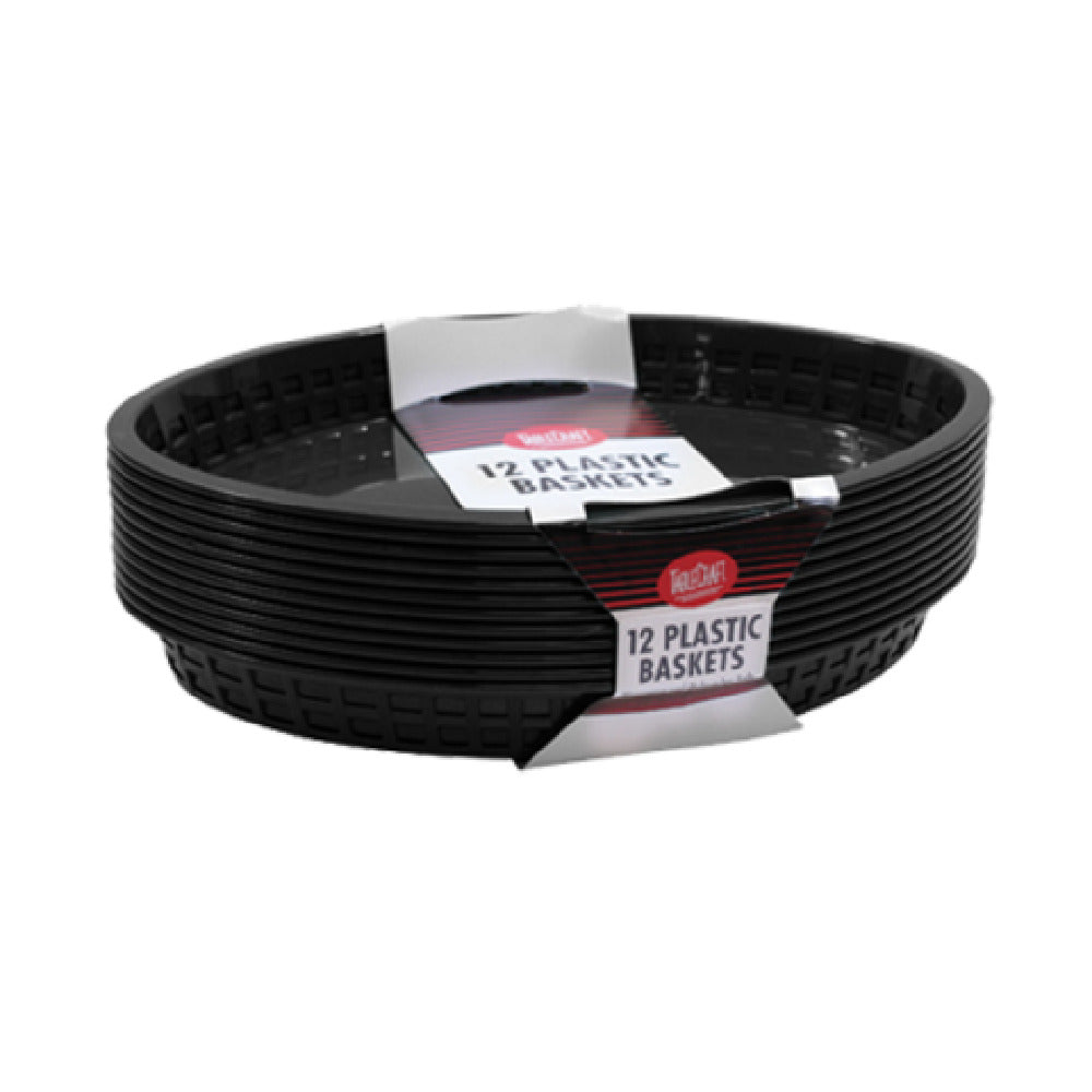The Tablecraft C1086BK Cash & Carry Texas Baskets, measuring 12-3/4" x 9-1/2" x 1-1/2", are versatile oval-shaped baskets designed to meet the needs of various segment markets within the food service industry. Crafted from durable polypropylene, these baskets are heat resistant up to 150°F/65°C, ensuring they can withstand the demands of everyday use. Their resilience makes them suitable for use under heat lamps, in dishwashers, and even in microwaves, providing a practical solution for busy kitchens. Available in a sleek black color, these baskets offer an aesthetic that complements a variety of dining environments, from casual eateries to food trucks and canteens. Made in the USA, the Tablecraft C1086BK baskets are available in a display merchandise pack, with 12 baskets per pack, and must be purchased in multiples of 3 packs. This ensures that establishments can adequately stock their supplies for consistent service. Their functional design and robust construction make them an ideal choice for food presentation and service, reflecting a commitment to quality and practicality in professional food service operations.