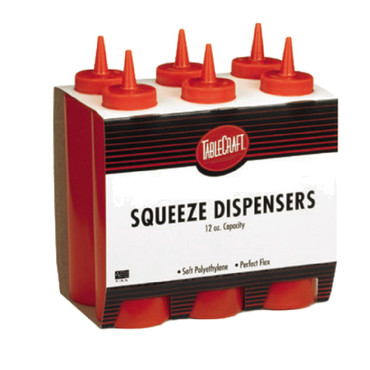 The Tablecraft C112K Cash & Carry Squeeze Dispenser is a versatile and practical solution for condiment dispensing needs, with a capacity of 12 oz. and a 38mm opening. This product is specifically designed for the efficient distribution of ketchup and other condiments, featuring a cone tip that allows precise control over the flow. Constructed from soft polyethylene PerfectFlex™, it offers durability and flexibility, making it ideal for high-traffic environments such as restaurants, cafeterias, and food stalls. This dispenser is dishwasher safe, ensuring ease of cleaning and maintenance, which is particularly beneficial for fast-paced food service operations. The distinctive red color of the dispenser not only helps in quick identification but also adds a vibrant touch to any condiment station. Proudly made in the USA, the Tablecraft C112K is available in a display merchandise pack of six and must be purchased in multiples of 12 packs. This makes it a cost-effective choice for businesses that require bulk purchases, such as catering companies and large-scale event organizers. Its thoughtful design and manufacturing underscore its utility and efficiency, catering to diverse market segments that demand reliable and user-friendly dispensing solutions.