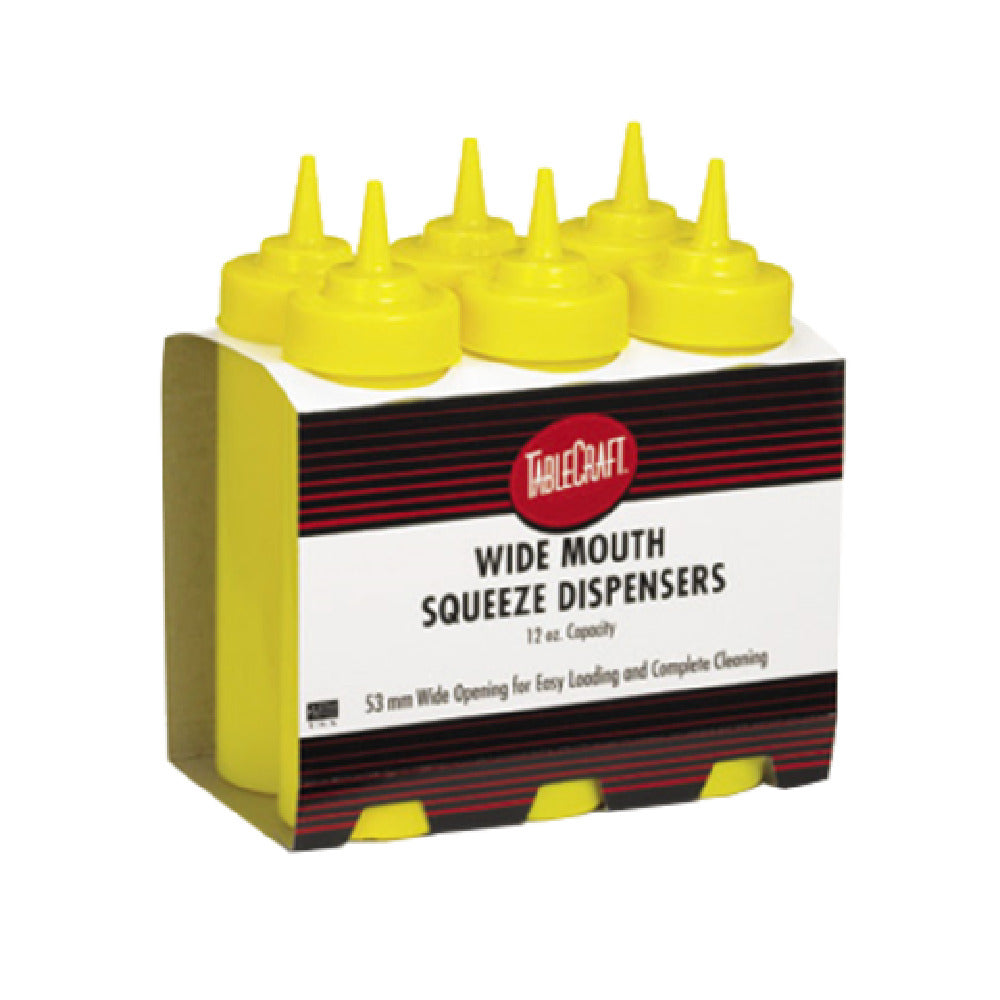 The Tablecraft C12463M Cash & Carry WideMouth™ Squeeze Bottle 24 Oz. 63mm Opening is a versatile tool favored across various sectors, including food service and hospitality, for its practical design and functionality. This squeeze bottle boasts a generous 24-ounce capacity, making it ideal for dispensing sauces, dressings, and condiments with ease. The wide 63mm opening is a standout feature, facilitating effortless filling and cleaning, which is particularly useful in high-volume settings. Available in a bright mustard yellow color, this bottle is both visually appealing and easy to identify in busy kitchen environments. Its construction is dishwasher safe, ensuring convenience and hygiene maintenance for users. The product's compliance with NSF standards highlights its commitment to safety and quality, reinforcing its suitability for professional use. Made in the USA, the Tablecraft C12463M reflects high manufacturing standards and durability. Packaged as display merchandise, it is available in packs of six, with a purchase requirement in multiples of eight packs, catering to bulk purchasing needs within the industry. This squeeze bottle is an essential item for any establishment aiming to improve efficiency and reliability in their condiment dispensing operations.