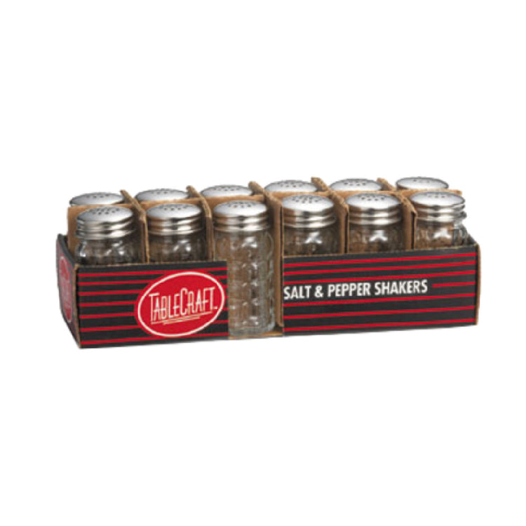 The Tablecraft C163-12 Cash & Carry Salt/Pepper Shaker is a compact and practical solution for both residential and commercial dining settings. Each shaker has a capacity of 1-1/2 oz., ideal for storing and dispensing salt and pepper with ease. Measuring 1-9/16" in diameter and 3-1/8" in height, these shakers boast a sleek and minimal profile, making them perfect for tabletop use where space is a premium. Crafted from nostalgia glass, they present a timeless aesthetic while ensuring durability and ease of cleaning, as they are dishwasher safe. The stainless steel tops add a touch of modern elegance and robust functionality, allowing for smooth dispensing. Available in a display merchandise pack containing 12 shakers, the Tablecraft C163-12 is designed for efficient bulk purchasing, suited to meet the needs of various market segments including restaurants, cafes, and catering services. Note that purchases must be made in multiples of 4 packs, aligning with commercial buying practices. This shaker set not only offers a practical solution for seasoning needs but also enhances the dining experience with its classic design and dependable performance.