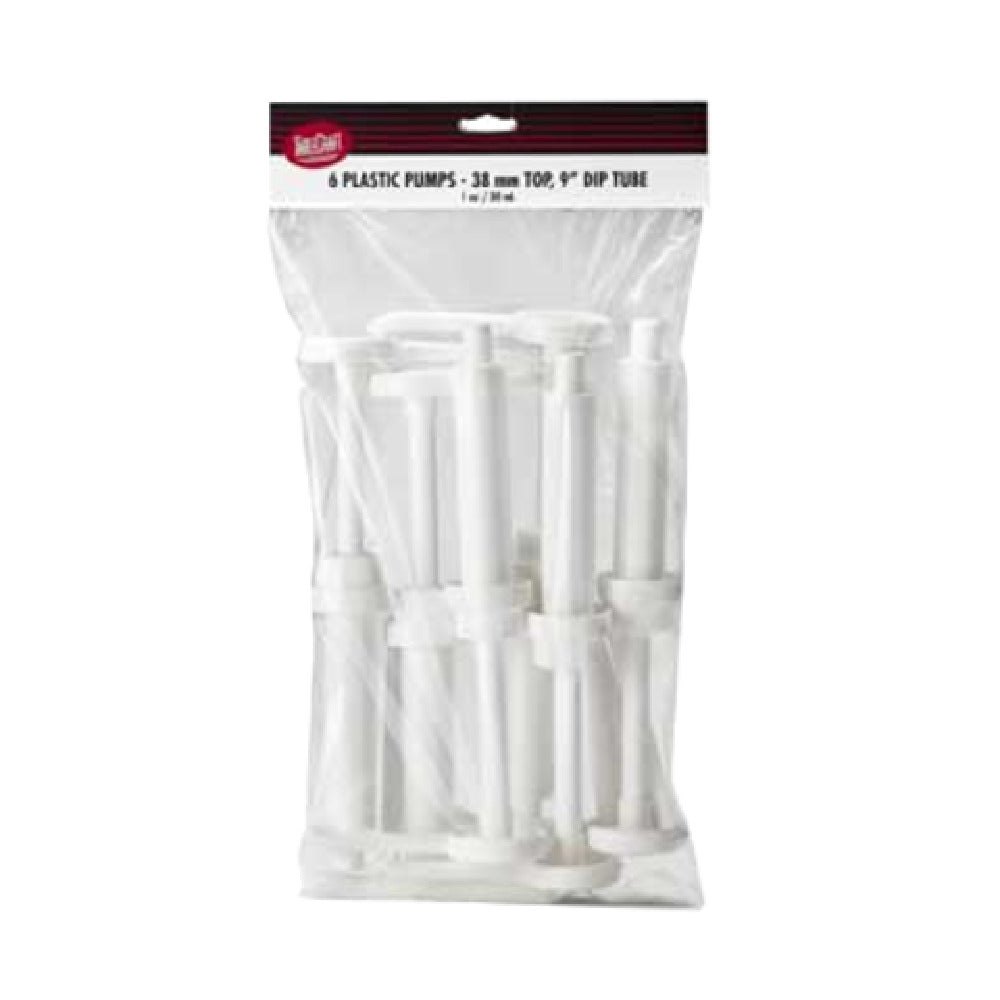 The Tablecraft C66238 Cash & Carry Syrup Pump Only - 1 Oz. - 38mm Top is an essential tool for both small and large-scale food service operations, offering precise dispensing solutions. Crafted with a durable plastic construction, this white syrup pump is designed to fit securely with a 38mm top, ensuring compatibility with a wide range of syrup bottles and containers. Its 11-inch dip tube reaches the bottom of most containers, maximizing product usage and minimizing waste. Each pump dispenses an exact 1-ounce portion, promoting consistency and control in serving sizes, which is particularly valuable in establishments focusing on portion control or cost management. The pump is conveniently dishwasher safe, facilitating easy cleaning and maintenance, which is critical in maintaining hygiene standards in busy commercial environments. Packaged in sets of six, with a minimum order requirement of one pack, the Tablecraft C66238 is ideal for businesses looking to streamline their syrup dispensing process with an efficient, reliable, and easy-to-maintain solution. Its straightforward design and robust construction make it a versatile choice for cafes, diners, and restaurants aiming to enhance their service efficiency and product presentation.