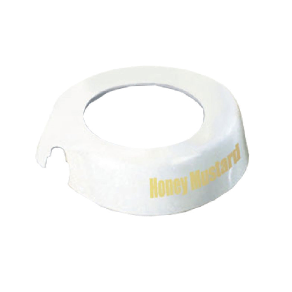 The Tablecraft CB10 Dispenser ID Collar - "Honey Mustard" is a specialized accessory designed to enhance the functionality and organization of condiment dispensers. This product is crafted from durable white plastic, ensuring longevity and reliability in various food service settings. Featuring a beige print, the ID collar clearly displays the label "Honey Mustard," facilitating quick and easy identification of condiments, thereby streamlining kitchen and serving operations. This collar is specifically engineered to fit seamlessly onto Tablecraft's dispenser models 483 and 484, ensuring a perfect fit and enhancing the overall aesthetic and operational efficiency of these units. Proudly made in the USA, the Tablecraft CB10 Dispenser ID Collar combines quality craftsmanship with practical application, making it a valuable addition for caterers, restaurants, and hospitality venues that prioritize efficiency and organization in their condiment dispensing systems. The precise fit and clear labeling provided by this ID collar contribute significantly to an orderly food service environment, catering to the needs of professionals who demand both functionality and reliability in their culinary operations.