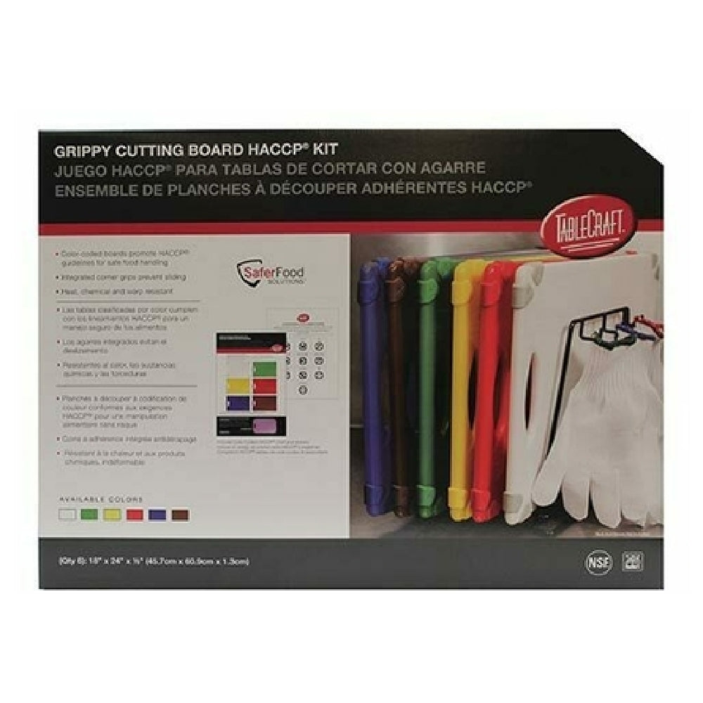 The Tablecraft CBG1824APK6 Cash & Carry Grippy Cutting Board HACCP® Kit 18" X 24" is a comprehensive solution designed to meet the rigorous demands of food safety and sanitation across different markets in the food industry. Featuring an integrated handle for ease of use, this cutting board kit incorporates anti-slip grips ensuring stability during operation. Its design includes integrated measurements in centimeters and inches, offering precision in food preparation. With dimensions of 18" x 24", this kit provides ample space for cutting tasks. The cutting boards are engineered to be heat, chemical, and warp-resistant, ensuring durability under various kitchen conditions. Dishwasher safe, they promise easy sanitation post-use. This kit includes one cutting board in each of the following colors - white, green, yellow, red, blue, and brown - aiding in the prevention of cross-contamination by adhering to the HACCP guidelines. The inclusion of different colors aligns with NSF standards, reinforcing its credibility in maintaining food safety. This kit is a minimum order of one, making it accessible for both large-scale kitchens and smaller establishments aiming to uphold high hygiene standards. The Tablecraft CBG1824APK6 is an essential tool for professionals seeking reliable and efficient food preparation solutions.