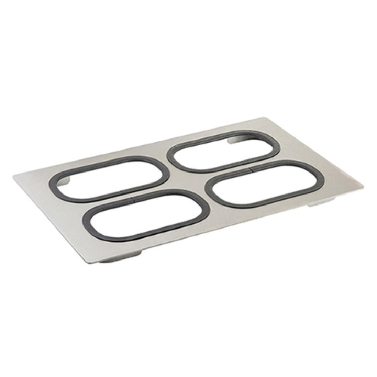 The TableCraft CW1110BRS Tri-Ply Serveware Templates - 21-5/8" x 13-1/2" - is a premium serveware solution designed to enhance both functionality and presentation in various food service environments. Constructed from 12-gauge stainless steel, this template boasts a robust and durable structure, ensuring longevity and reliability in high-volume settings. The brushed finish adds a touch of elegance, making it suitable for upscale dining experiences as well as casual settings. A key feature of this product is its compatibility with (4) 123511 or 123512 models, allowing for versatile arrangements to accommodate different serving needs. The inclusion of silicone gaskets around the cut-outs ensures a secure fit and minimizes the risk of spills, enhancing the overall efficiency of food service operations. This serveware template is also dishwasher safe, simplifying the cleaning process and maintaining high standards of hygiene. Ideal for caterers, restaurants, and hospitality venues, the TableCraft CW1110BRS serves as a valuable asset in delivering a seamless and polished dining experience across various segments of the industry.