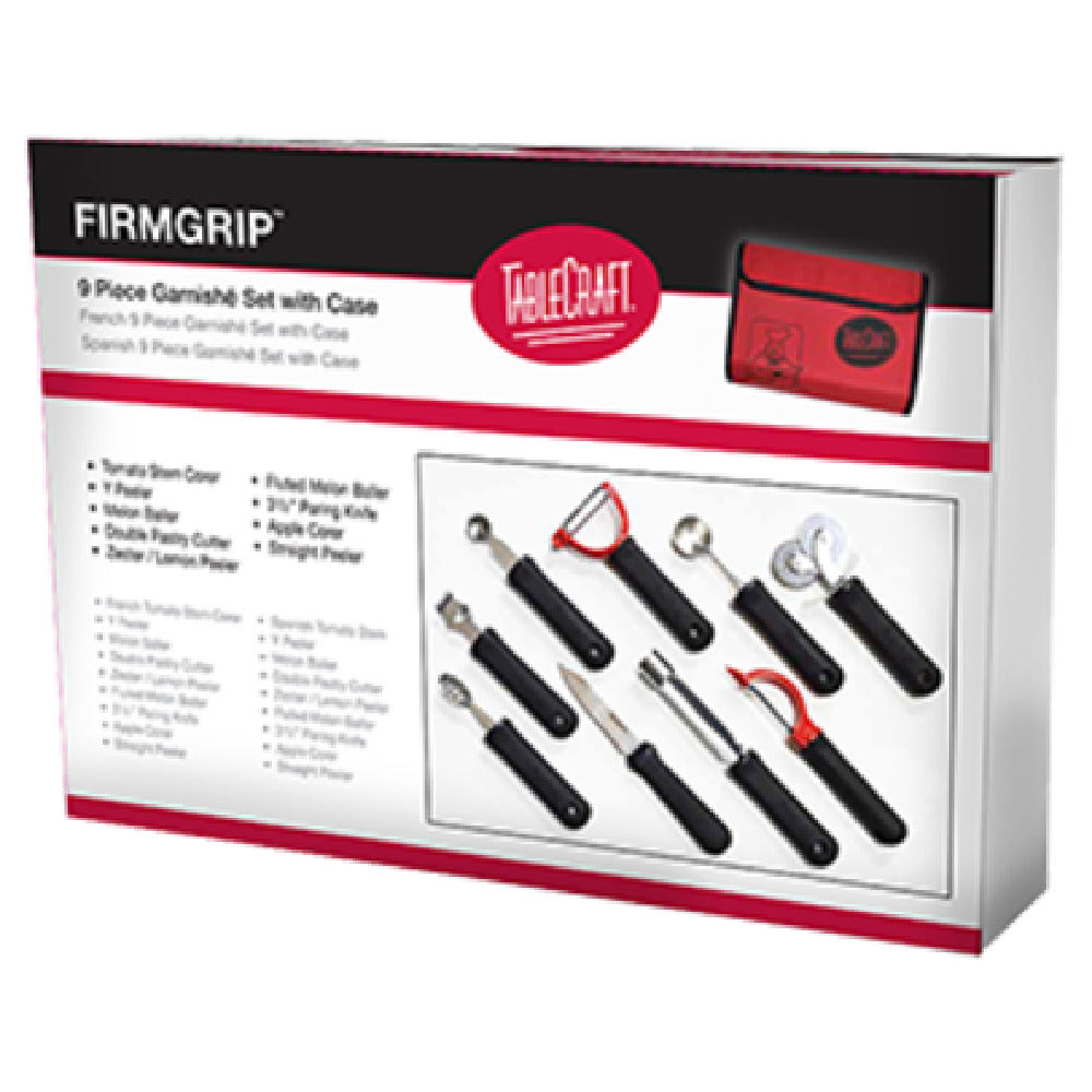The Tablecraft E5600-9 Cash & Carry FirmGrip® Garnishé™ Set is a comprehensive garnishing toolkit ideal for culinary professionals and home chefs alike. This set's unique value lies in its inclusion of essential tools for precise garnishing tasks, ensuring versatility in food presentation. The set includes a zester/lemon peeler for creating fine citrus zest or peeling fruits with ease. Additionally, it features a fluted melon baller and a standard melon baller, offering options for varying sizes of fruit spheres, alongside a tomato stem corer that simplifies the removal of unwanted stems. A garnishing knife is part of the set, essential for intricate cutting tasks, and a double pastry cutter that provides both straight and fluted edges. The straight peeler and apple corer complete the set, making it a go-to collection for diverse peeling and coring needs. Each tool is equipped with a black ergonomic soft grip handle, ensuring comfort during prolonged use, and the entire set is dishwasher safe for convenience. It comes encased in a nylon case, facilitating organized storage and easy transportation. This set is manufactured with a minimum order requirement of one set, catering to both individual needs and bulk purchases for various market segments.