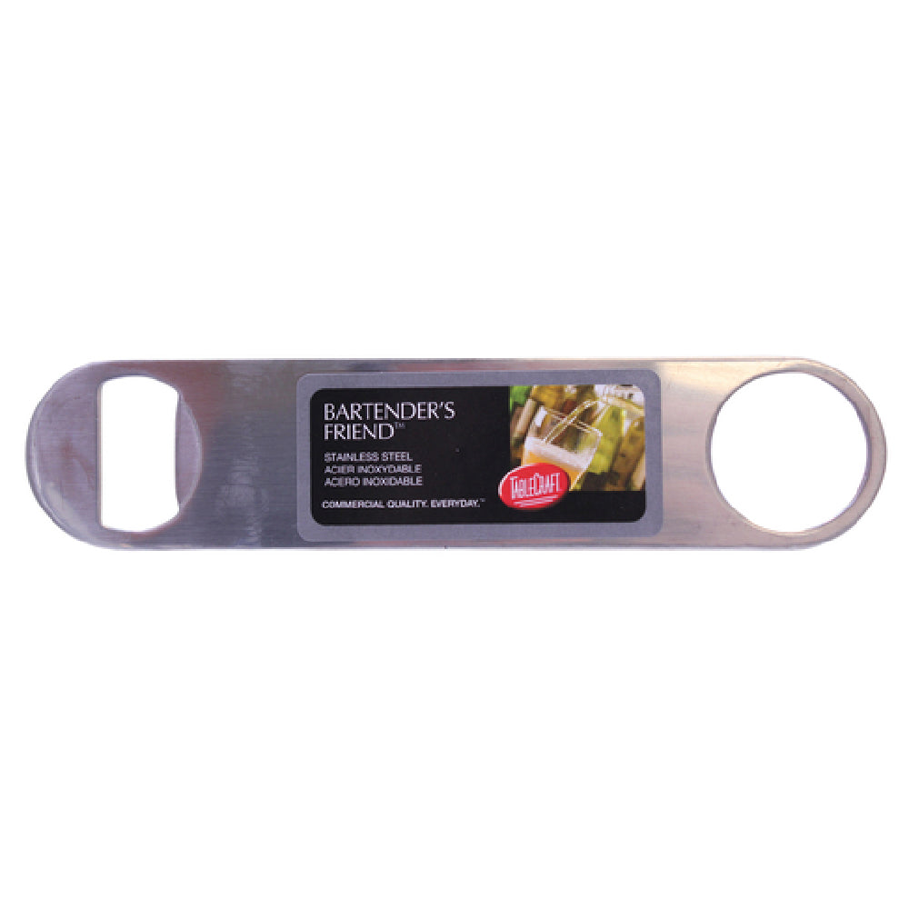 The TableCraft H3996 Cash & Carry Pocket Bottle Opener is a practical and durable tool designed for both personal and professional use. Measuring 7 inches in length, this flat bottle opener is crafted from high-quality stainless steel, ensuring longevity and resistance to corrosion. Its sleek design makes it easy to carry and handle, catering to bartenders and casual users alike who require a reliable bottle-opening solution. One of the standout features of this bottle opener is its dishwasher-safe attribute, which allows for convenient and hygienic cleaning, making it an excellent choice for high-demand environments, such as bars and restaurants, where quick turnover and cleanliness are essential. The TableCraft H3996 is not only functional but also versatile, making it an ideal companion for a range of settings, from bustling commercial spaces to intimate gatherings at home. Its compact and flat design ensures it fits comfortably in pockets, aprons, or drawers, highlighting its portability and ease of access. The combination of stainless steel construction and user-friendly features makes the TableCraft H3996 Cash & Carry Pocket Bottle Opener a valuable tool for anyone in the hospitality industry or for individuals seeking a dependable and efficient bottle opening solution.