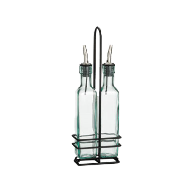 The Tablecraft H9085NBK Cash & Carry Prima™ Set consists of two 8-1/2 oz. square glass bottles with a distinct green tint, designed to add a touch of elegance to any setting. These bottles are dishwasher safe, ensuring easy maintenance and long-lasting use. Accompanying the bottles is a stainless steel pourer, which is recommended for hand washing to maintain its quality and performance. The set is completed with a black powder-coated metal rack that not only provides sturdy support but also complements the aesthetic appeal of the glass bottles. To maintain the finish and durability of the metal rack, it should also be hand washed. This set is designed to be purchased in multiples of six, which makes it a convenient and efficient option for businesses or individuals looking to upscale their service presentation. Ideal for a range of industries, from hospitality to retail, the Tablecraft H9085NBK set combines functionality with style, making it a versatile choice for various market segments. Whether for organizing essential condiments in a restaurant or enhancing product displays in retail settings, this glass bottle set offers practical and aesthetic benefits for diverse professional environments.