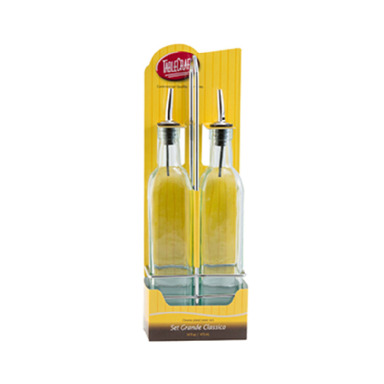 The Tablecraft H916N Cash & Carry Prima™ Set is a versatile and functional product designed for efficient liquid storage and dispensing, ideal for both personal and professional use. Each set includes two 16 oz. square green tint glass bottles, known for their durability and aesthetic appeal, making them suitable for a variety of environments, from home kitchens to restaurant settings. The bottles are dishwasher safe, ensuring easy and convenient cleaning. Complementing the bottles is a stainless steel pourer, which, while hand wash only, offers precise and controlled dispensing of liquids, ideal for oils, vinegars, or dressings. The set also includes a chrome-plated rack, again hand wash only, that provides a stylish and organized way to store the bottles, enhancing accessibility and presentation. This set must be purchased in multiples of six, catering to bulk buyers or commercial establishments looking to maintain a consistent and professional look across their service areas. The combination of practicality and style makes the Tablecraft H916N Cash & Carry Prima™ Set an excellent choice for those seeking reliable and aesthetically pleasing kitchen accessories, encompassing both functionality and design in one cohesive package.
