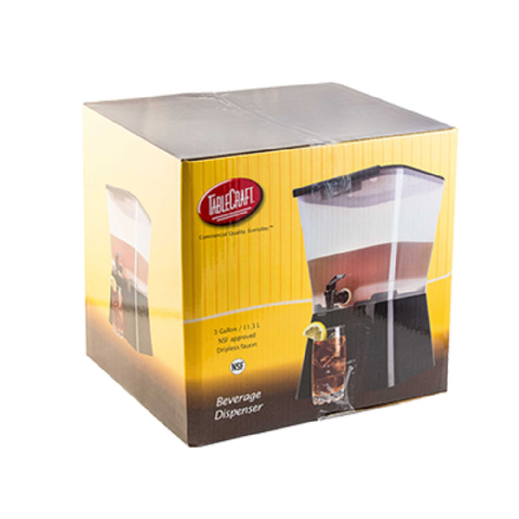 The Tablecraft H953 Cash & Carry Beverage Dispenser is a reliable and efficient solution for serving large quantities of beverages, with a capacity of 3 gallons, making it ideal for various commercial settings. This dispenser measures 10-7/8 inches in width, 12-1/2 inches in depth, and 16-3/4 inches in height, providing ample space for a substantial volume of drinks while maintaining a compact footprint. Featuring a 7-inch faucet clearance, it accommodates a wide range of cups and containers, enhancing its versatility. The dispenser is equipped with a single, standard Tomlinson® faucet, ensuring consistent and controlled pouring. Crafted from durable polypropylene, the unit is dishwasher safe, facilitating easy cleaning and maintenance. The black color adds a sleek, professional appearance, making it suitable for various environments. Additionally, this beverage dispenser is NSF certified, assuring its compliance with rigorous health and safety standards. It is FDA approved, emphasizing its suitability for food service applications. Designed for practicality, the Tablecraft H953 must be purchased in multiples of two, catering to bulk purchase needs in commercial markets. This beverage dispenser is an excellent choice for catering services, restaurants, and event venues that require a reliable and high-capacity beverage serving solution.