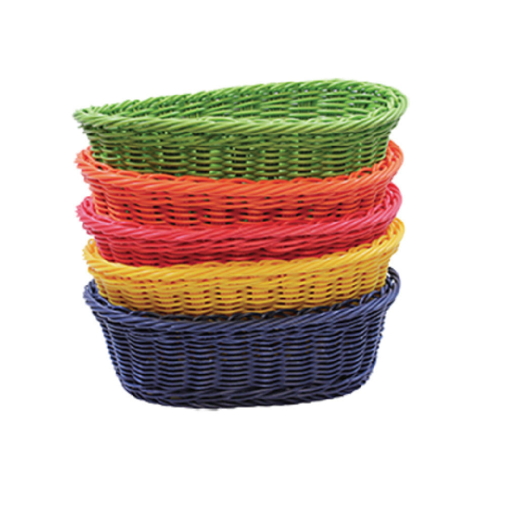 The Tablecraft HM1174A Ridal Collection™ Basket is an oval-shaped, versatile accessory measuring 9-1/4" x 6-1/4" x 3-1/4". This basket is crafted from a hand-woven polypropylene cord, ensuring durability and a sophisticated appearance. It is heat resistant up to 150°F (65°C), making it suitable for various food service environments. The basket is both heat lamp and dishwasher safe, providing convenience and efficiency in both display and cleaning processes. This product is available in an assortment of vibrant colors, including blue, green, red, yellow, and orange, highlighting its aesthetic appeal and adaptability to different ambiance settings. Each purchase includes one basket of each color, with a mandatory minimum purchase of five, catering to establishments that require multiple units. The Tablecraft HM1174A basket serves as a reliable and stylish solution for restaurants, cafes, and catering services, looking for quality presentation tools that align with their operational needs.