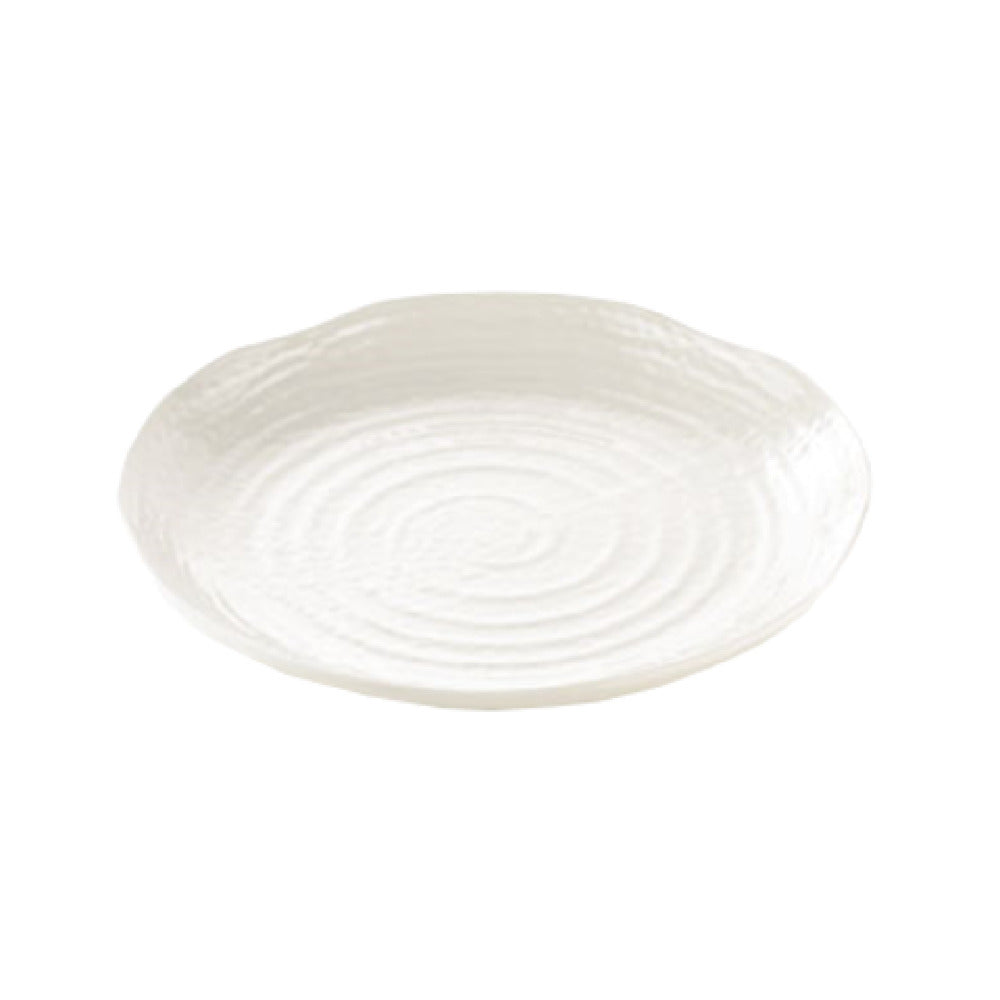 The Tablecraft M14 Frostone Collection™ Tray 14" Dia. Round is a meticulously designed serving solution, ideal for various professional food service environments. This tray features a substantial 14-inch diameter, offering ample space for a range of culinary presentations from appetizers to desserts. Its round form is complemented by a pebbled pattern, adding a touch of elegance and texture to the tabletop display. Constructed from durable melamine, the tray is both lightweight and robust, ensuring a long-lasting performance under rigorous use. A key technical specification is its temperature resistance, rated safe up to 212°F (100°C), making it suitable for serving warm dishes without compromising the integrity of the tray. Additionally, the tray is dishwasher safe, simplifying cleanup and maintenance in busy kitchen settings. The pristine white finish of the Tablecraft M14 Frostone Collection™ Tray provides a versatile backdrop that enhances the visual appeal of any dish, making it a practical choice for caterers, restaurants, and hospitality venues seeking to elevate their food presentation with reliability and style.