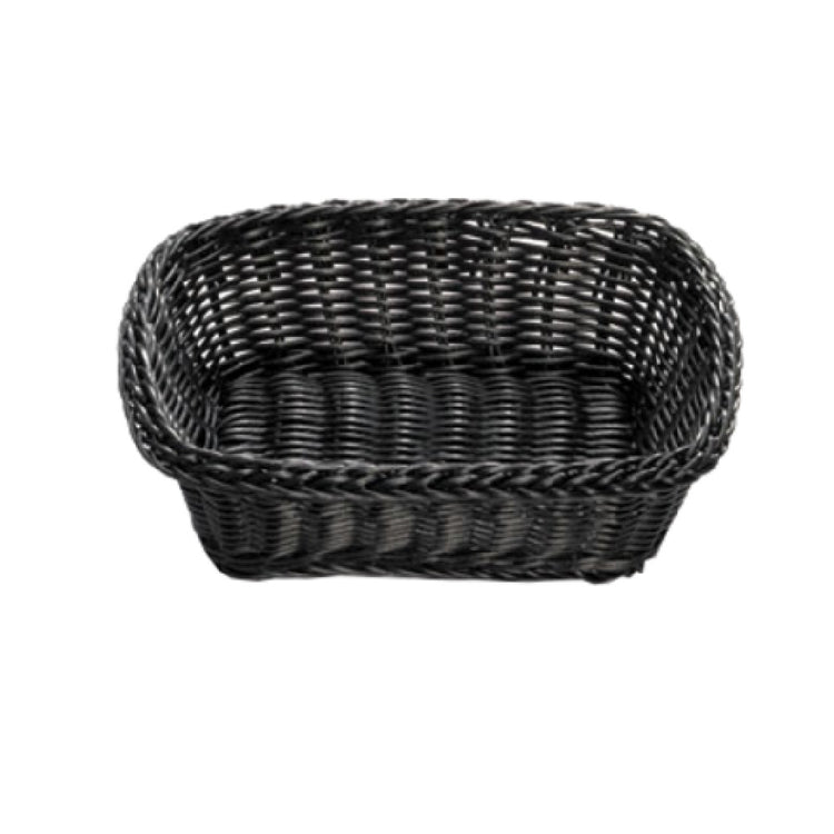 The Tablecraft M2485 Ridal Collection™ Basket is a meticulously crafted rectangular basket with dimensions of 11-1/2" x 8-1/2" x 3-1/2". This hand-woven piece is constructed from sturdy polypropylene, featuring a heavy solid cord design for enhanced durability. Its black color gives it a sleek, modern appearance, making it suitable for a variety of settings. A key feature of this basket is its heat resistance, withstanding temperatures up to 150°F (65°C), allowing it to be used safely under heat lamps. Furthermore, it is dishwasher safe, ensuring easy cleaning and maintenance, which is particularly beneficial in high-volume food service environments. The requirement to purchase this item in multiples of six caters to businesses with bulk purchasing needs, such as restaurants, hotels, or catering services seeking uniformity and consistency in their tabletop presentations. The Tablecraft M2485 Ridal Collection™ Basket combines practicality with aesthetic appeal, making it a versatile addition to any industry that values both form and function in its service operations.