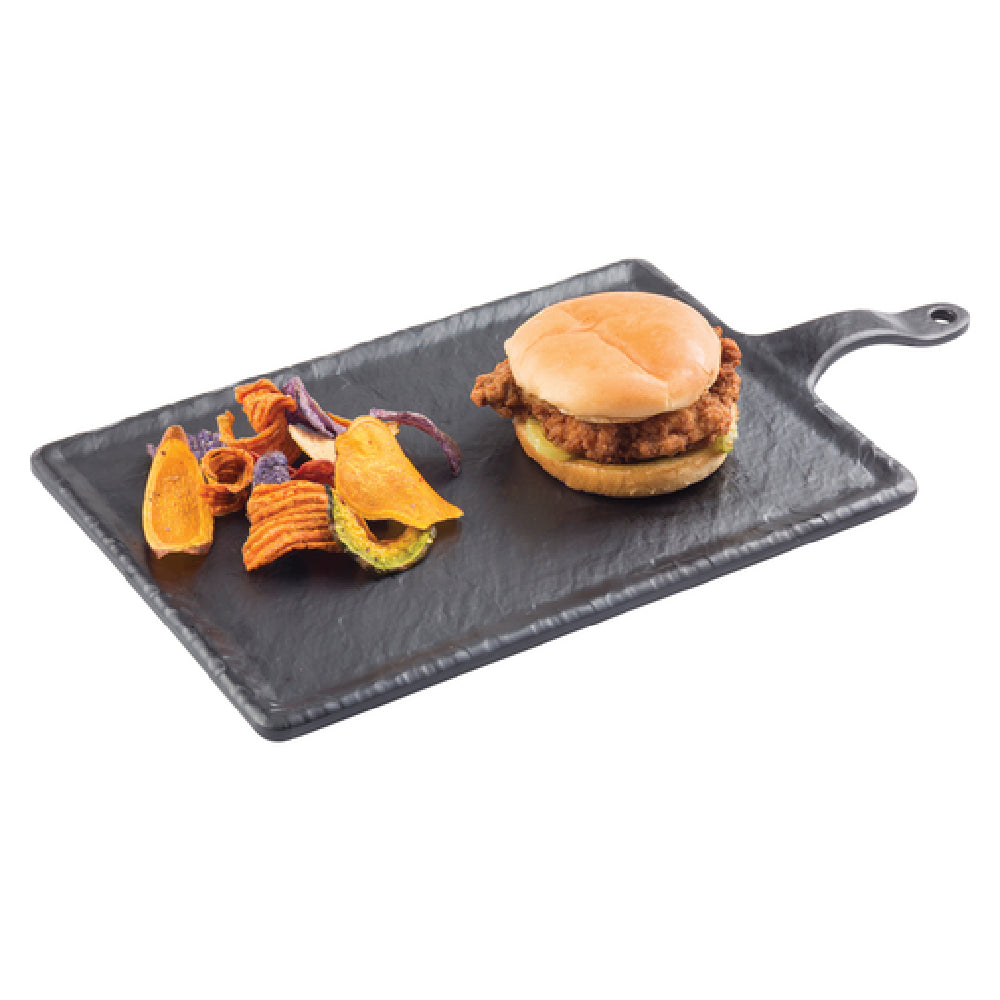 The Tablecraft MSP5120 Frostone Collection™ Serving Paddle is a versatile and durable serving solution designed to meet the needs of various segments within the food service industry. Measuring 15-3/4 inches by 7-3/4 inches, this rectangular platter comes with a convenient 5-inch handle, making it easy to serve appetizers, charcuterie, or desserts. Crafted from black slate melamine, it combines the aesthetic appeal of natural slate with the superior durability of melamine. This serving paddle is temperature-safe up to 212°F (100°C), ensuring it can handle warm dishes without compromising integrity. Additionally, its dishwasher-safe feature facilitates easy and efficient cleaning, meeting the high demands of busy restaurant kitchens. The Tablecraft MSP5120 Frostone Collection™ Serving Paddle is particularly advantageous for caterers and hospitality professionals seeking a reliable and stylish serving piece that withstands rigorous daily use. Its sleek design and practical features make it an excellent choice for upscale dining establishments and casual eateries alike, providing an elegant presentation for a variety of dishes while ensuring long-lasting performance.