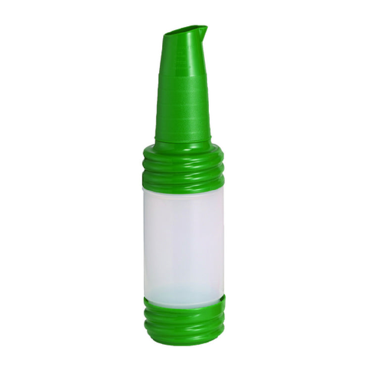 The Tablecraft N32VGN PourMaster® Bottle With V-Neck Top™ is a versatile and efficient solution for beverage and condiment storage and dispensing needs. This model features a unique V-Neck Top™, which ensures easy and controlled pouring, making it particularly useful for busy bar settings or restaurant kitchens where precision and speed are essential. The bottle is dishwasher safe, which facilitates easy cleaning and maintenance, a key feature for establishments prioritizing hygiene and efficiency. This PourMaster® Bottle comes in a distinctive green color, allowing for easy identification and organization within a color-coded system, ideal for environments with multiple flavor or ingredient options. This product is designed to fit seamlessly into various segment markets, including hospitality, catering, and food service industries, where durability and functionality are paramount. Crafted by TableCraft Products, known for their commitment to quality and innovation, this bottle is engineered to enhance operational efficiency, combining practicality with an elegant design. Whether used for mixers, sauces, or syrups, the Tablecraft N32VGN PourMaster® Bottle With V-Neck Top™ remains a reliable and indispensable tool for any professional setting.