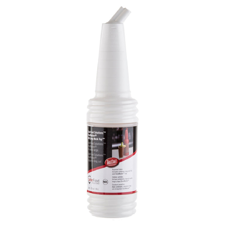 The Tablecraft N32W PourMaster® Long Neck Top™ for SaferFood Solutions™ PourMaster® Series is an essential component for any professional kitchen seeking precision and efficiency in food and beverage service. Engineered to accommodate a volume of 1 quart, this product is part of the innovative PourMaster® series, renowned for its advanced safety and usability features. The Long Neck Top™ design enhances control and accuracy in pouring, making it a versatile choice for a variety of applications, from dressings and oils to sauces and flavorings. Its white color contributes to a clean and modern aesthetic, seamlessly integrating into any kitchen environment. The product is dishwasher safe, ensuring effortless maintenance and hygiene, a crucial aspect for food service operations adhering to high safety standards. This makes it particularly valuable for segments such as restaurants, catering services, and food preparation facilities where cleanliness and efficiency are paramount. The Tablecraft N32W PourMaster® Long Neck Top™ stands out for its blend of practicality and quality, supporting a safer and more productive kitchen workflow.