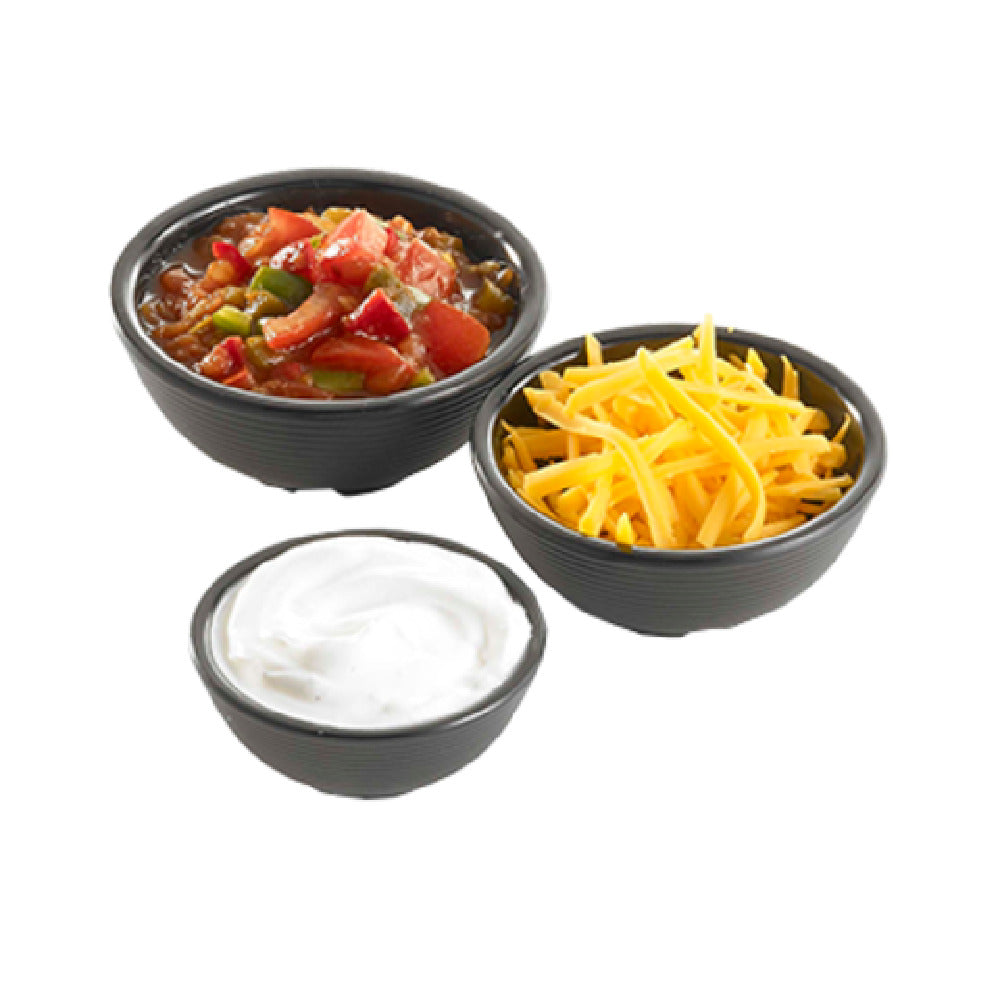 The Tablecraft RAM3RBK SaferFoods Solutions™ Ramekin 3 Oz. Round is a versatile and reliable dining accessory designed to meet the diverse needs of the food service industry. With a capacity of 3 ounces, this round ramekin is perfect for serving condiments, sauces, or small portions of food. It features a ribbed design that enhances grip and aesthetic appeal, making it a practical choice for both casual and formal dining settings. Made from durable melamine, this ramekin is built to withstand the rigors of everyday use. It is safe for temperatures up to 158°F/70°C, ensuring it can handle a variety of hot and cold applications without compromising structural integrity. Additionally, the black finish adds a sleek and professional look, suitable for any table setting. The Tablecraft RAM3RBK is dishwasher safe, simplifying the cleaning process and maintaining hygiene standards. This product serves as an invaluable tool for restaurants, catering services, and other food service establishments that prioritize functionality and style in their tableware solutions.