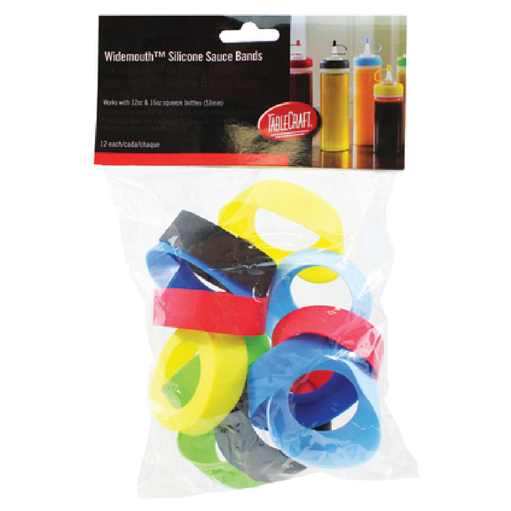The Tablecraft SB53A Cash & Carry Widemouth™ Sauce Bands 53mm Fits All 53mm Squeeze Bottles (excludes 32 Oz. Bottles) are versatile accessories designed to enhance the functionality of your kitchen storage solutions. These sauce bands, which are dishwasher safe and made from durable silicone, are engineered to fit all 53mm squeeze bottles, with the exception of 32 oz. bottles, offering a broad scope of application in various culinary settings. Each pack includes an assortment of colors - featuring two of each: yellow, blue, red, black, light blue, and light green - totaling 12 bands per pack, with a minimum order requirement of one pack. This product is ideal for establishments seeking to improve organization and presentation, such as restaurants, catering services, and food trucks. By utilizing these bands, users can easily identify and differentiate between different sauces, ensuring efficiency in fast-paced environments. The Tablecraft SB53A bands are an essential tool for any commercial kitchen that prioritizes functionality and organization, making them a practical and colorful addition to the culinary industry.