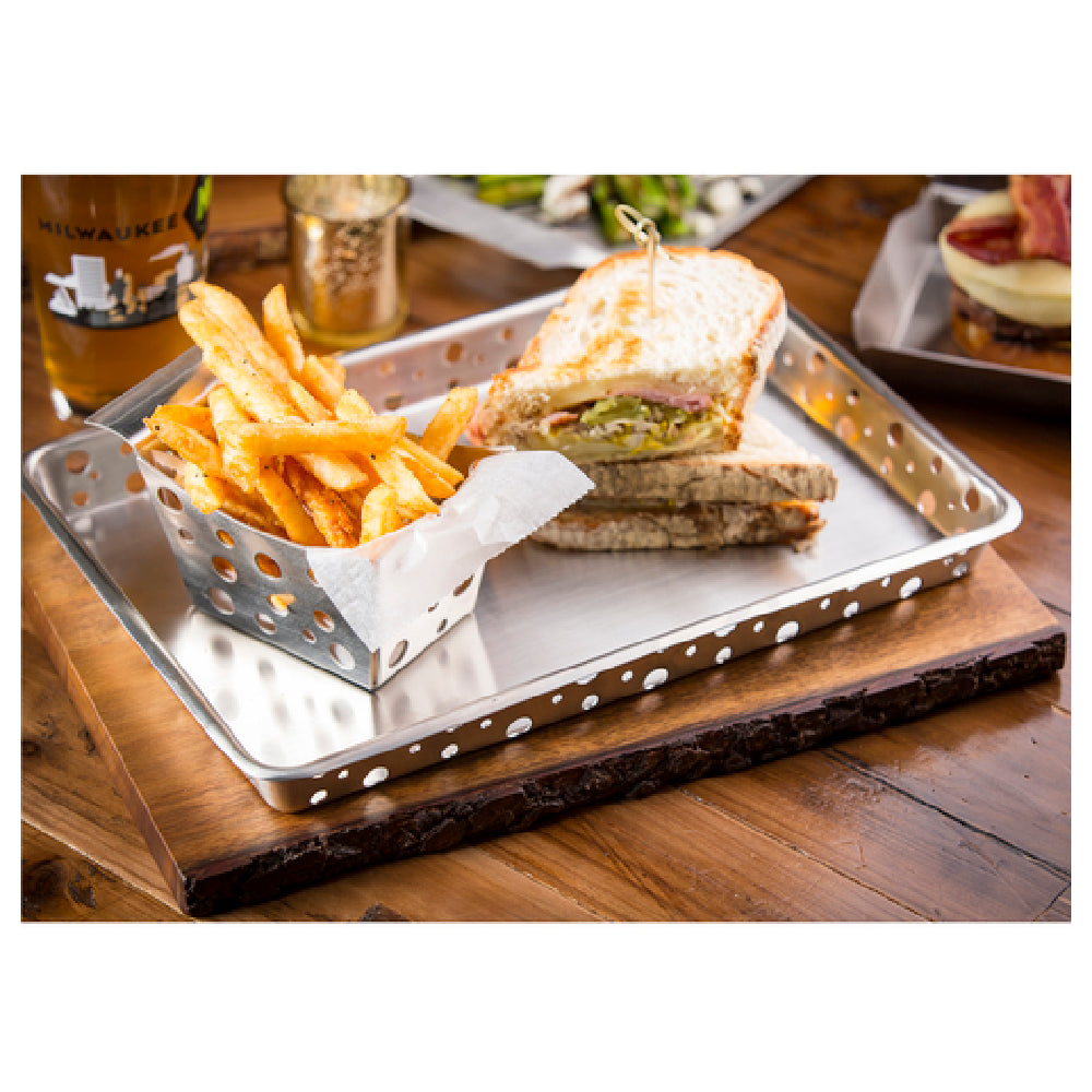 The Tablecraft SCB965 Serving Tray is a meticulously crafted rectangular tray measuring 9 inches by 6-1/2 inches by 1-1/4 inches, designed to enhance both functionality and aesthetic appeal in various food service settings. Engineered from high-quality stainless steel, this serving tray features a brushed finish, providing a sleek, modern look that complements any table setting. The solid bottom ensures stability and durability, making it suitable for a range of uses from casual dining to formal events. The distinctive circle stamped edges add a touch of elegance and help prevent spills, making it a practical choice for servers and hosts alike. This serving tray is dishwasher safe, offering effortless cleaning and maintenance, essential for fast-paced environments like restaurants and catering services. Its durable construction and stylish design make the Tablecraft SCB965 Serving Tray a versatile and valuable addition to any establishment seeking to combine reliability with visual appeal. Whether used for presenting appetizers, desserts, or beverages, this serving tray meets the demands of different market segments within the hospitality industry, providing a robust solution for efficient and sophisticated food presentation.