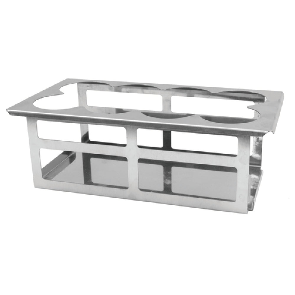 The Tablecraft SQH8 Squeeze Bottle Template is a meticulously designed kitchen accessory engineered to enhance organizational efficiency in foodservice environments. Measuring 13 inches by 7 inches by 4-1/2 inches, this template is crafted from premium 18/8 stainless steel, which is renowned for its durability and resistance to corrosion. It is specially constructed to securely hold up to eight squeeze bottles, each with a capacity of 16 ounces, making it an ideal tool for busy commercial kitchens, cafes, or catering services that require swift access to condiments or sauces. Its dishwasher-safe feature ensures easy maintenance and hygiene, which is crucial in high-paced culinary settings. The Tablecraft SQH8's sleek and practical design simplifies the workflow by keeping bottles neatly arranged and readily accessible, thereby enhancing productivity and reducing clutter. This product is particularly advantageous for staff in restaurant kitchens or food preparation areas where space optimization and quick service are priorities. By integrating this squeeze bottle template into their operations, businesses stand to heighten their level of service efficiency, making it a valuable asset in any foodservice operation seeking to streamline its condiment or ingredient management system.