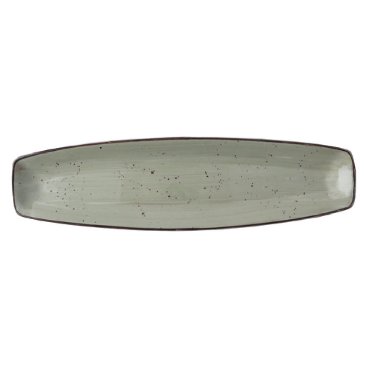 The Tableware Solutions USA 32CURV191-02 Platter is a distinctively designed rectangular dish with dimensions of 14-1/5 inches by 3-7/10 inches. This unique platter showcases a convex, curved structure, making it a standout choice for presenting culinary creations. Its construction emphasizes durability, being scratch-resistant, which is essential for maintaining a pristine appearance even with frequent use. Additionally, this platter is both oven and microwave safe, offering versatility in cooking and serving. It's also dishwasher proof, ensuring easy cleaning and maintenance. A notable feature is its classification under the 'Rustics by Continental' line, presented in a light green hue, which is not just aesthetic but also functional as it includes a Life Edge Chipping Warranty, providing assurance against chipping under normal use. This product is packed in cases of 12, catering to both commercial and residential markets that require bulk purchases. Ideal for restaurants, catering services, and home kitchens, the Tableware Solutions USA 32CURV191-02 Platter combines practical design with aesthetic appeal, making it a valuable addition to any tableware collection.
